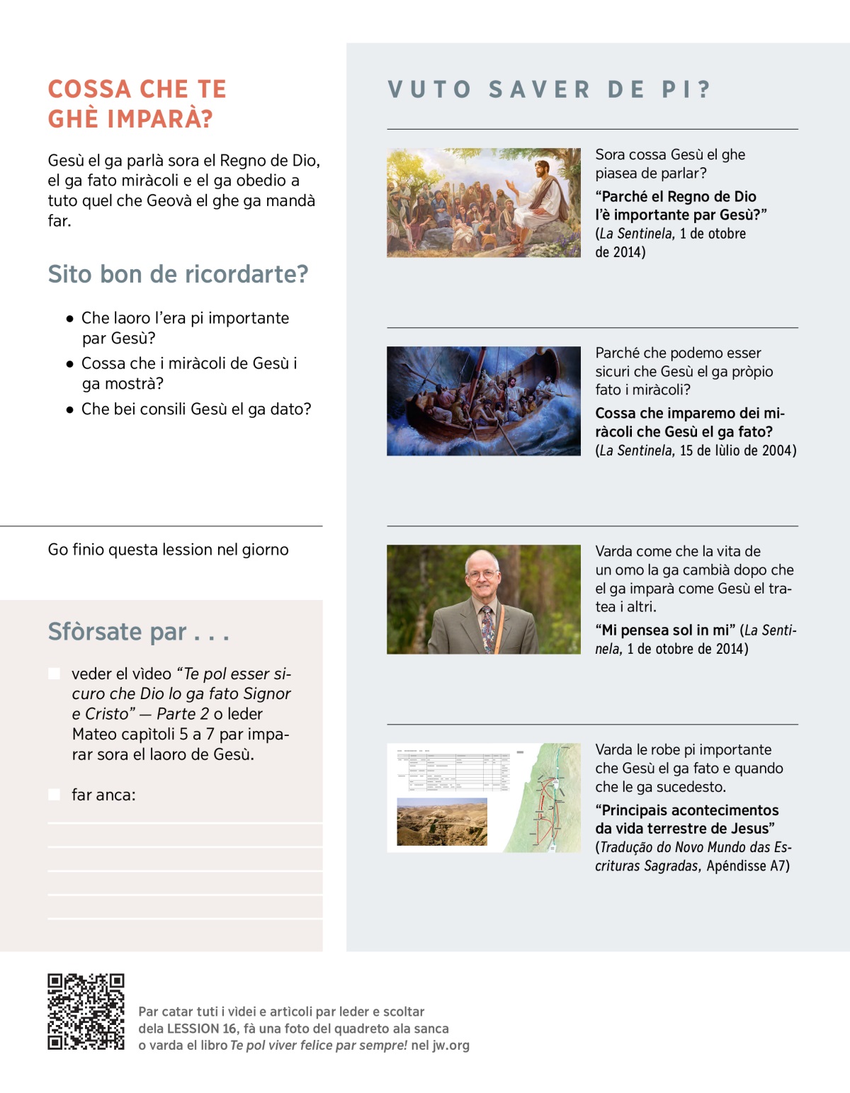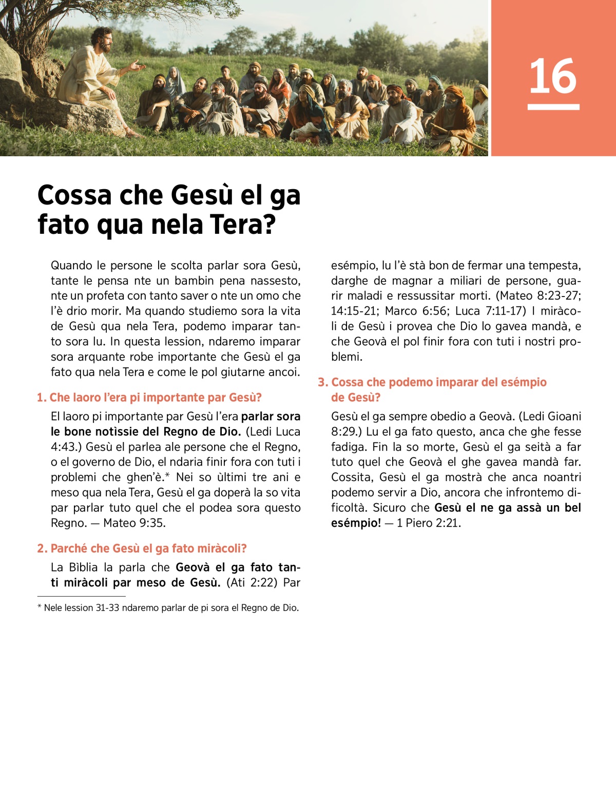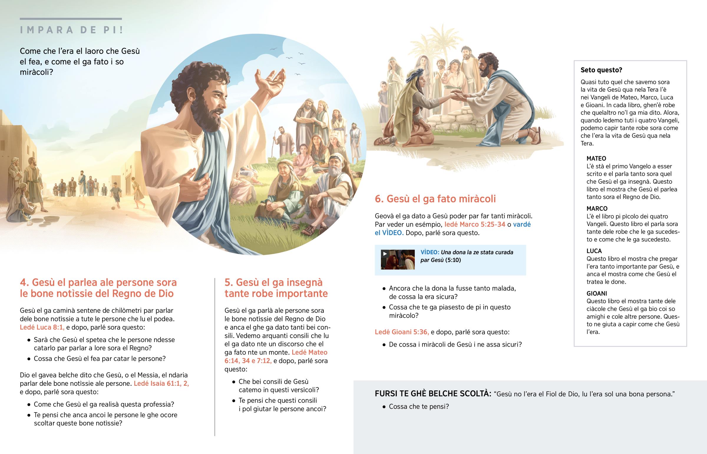 Quando le persone le scolta parlar sora Gesù, tante le pensa nte un bambin pena nassesto, nte un profeta con tanto saver o nte un omo che l’è drio morir. Ma quando studiemo sora la vita de Gesù qua nela Tera, podemo imparar tanto sora lu. In questa lession, ndaremo imparar sora arquante robe importante che Gesù el ga fato qua nela Tera e come le pol giutarne ancoi.
