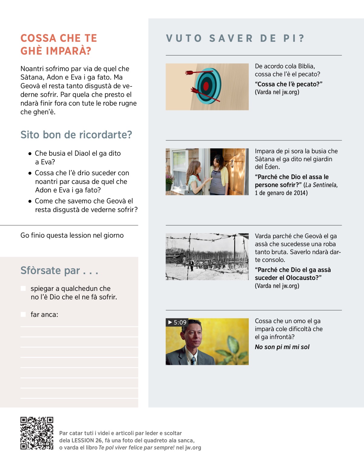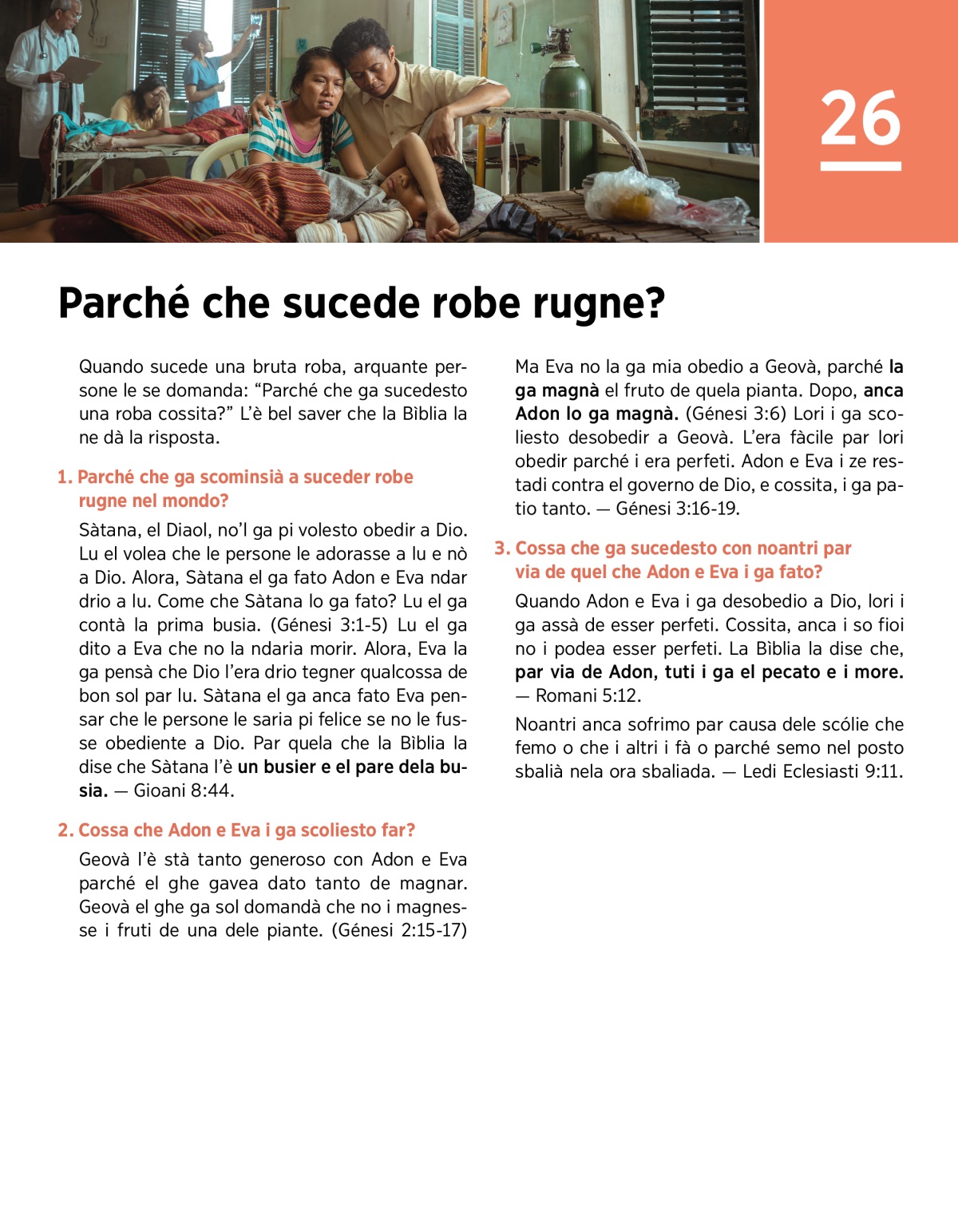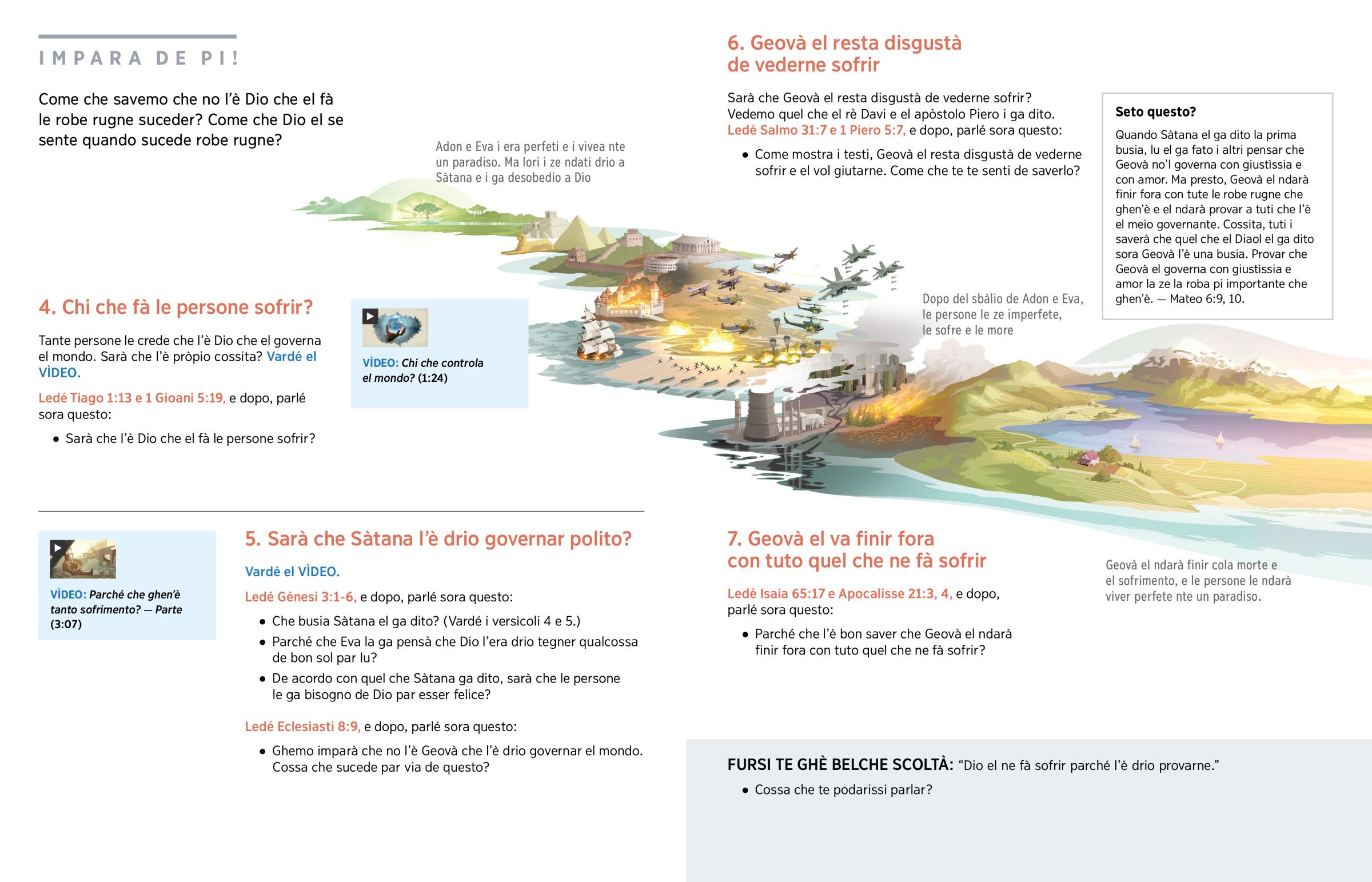 Noantri sofrimo par via de quel che Sàtana, Adon e Eva i ga fato. Ma Geovà el resta tanto disgustà de vederne sofrir. Par quela che presto el ndarà finir fora con tute le robe rugne che ghen’è.
