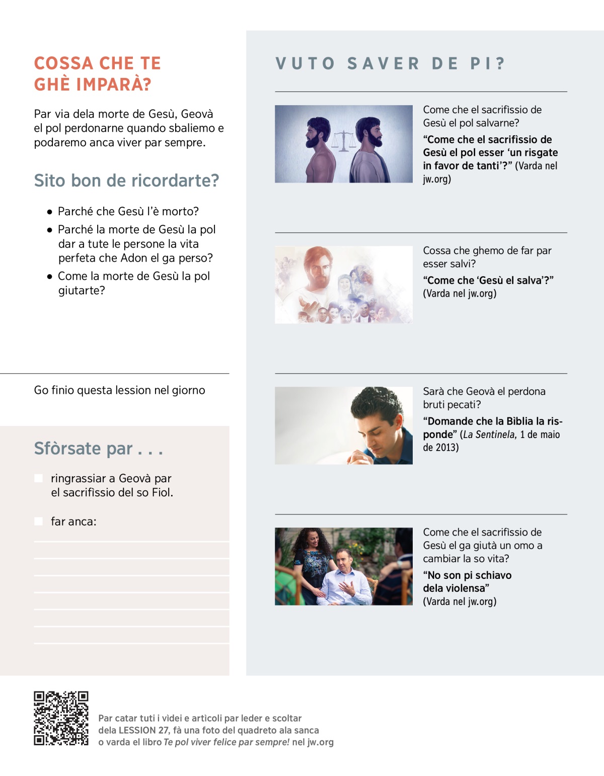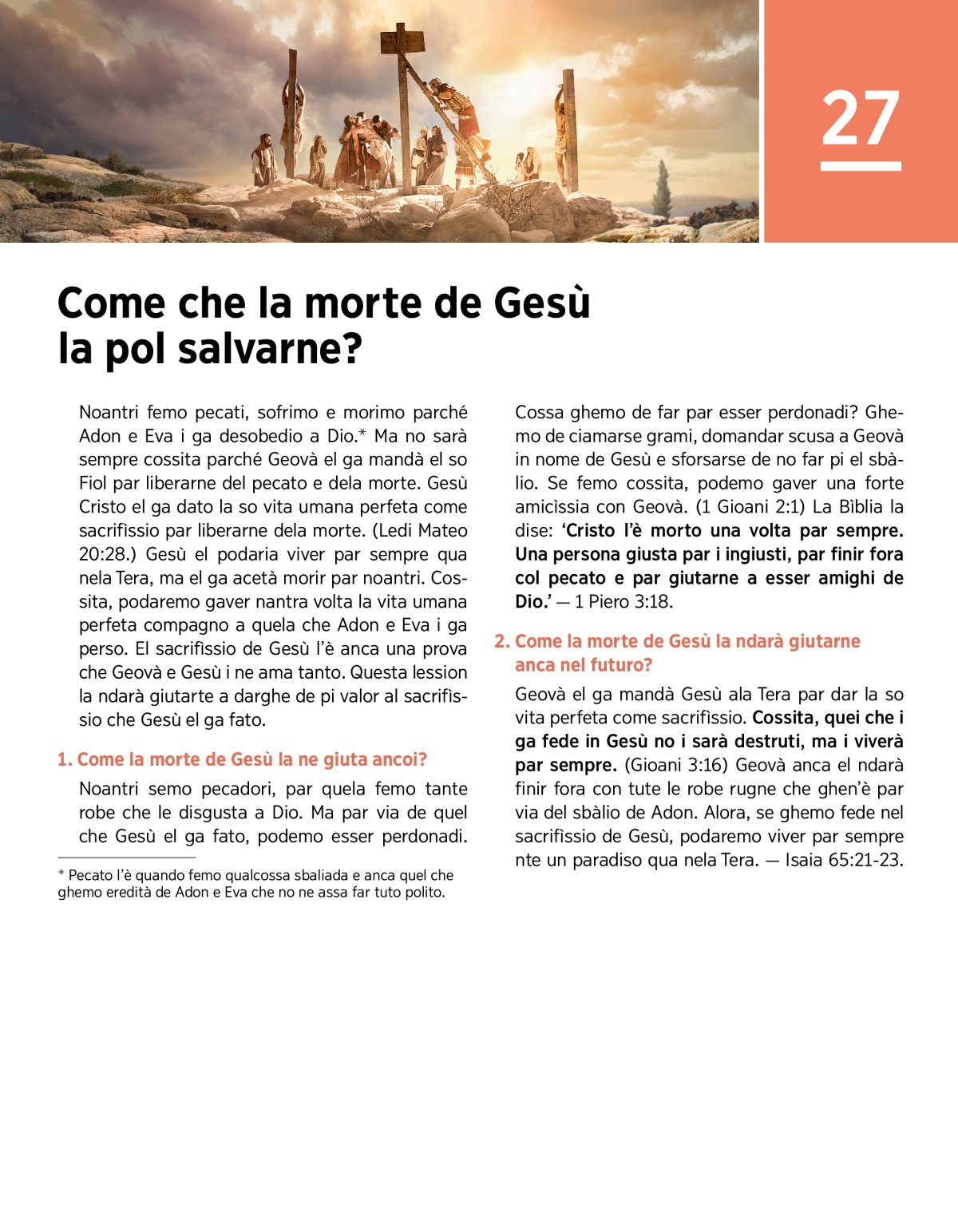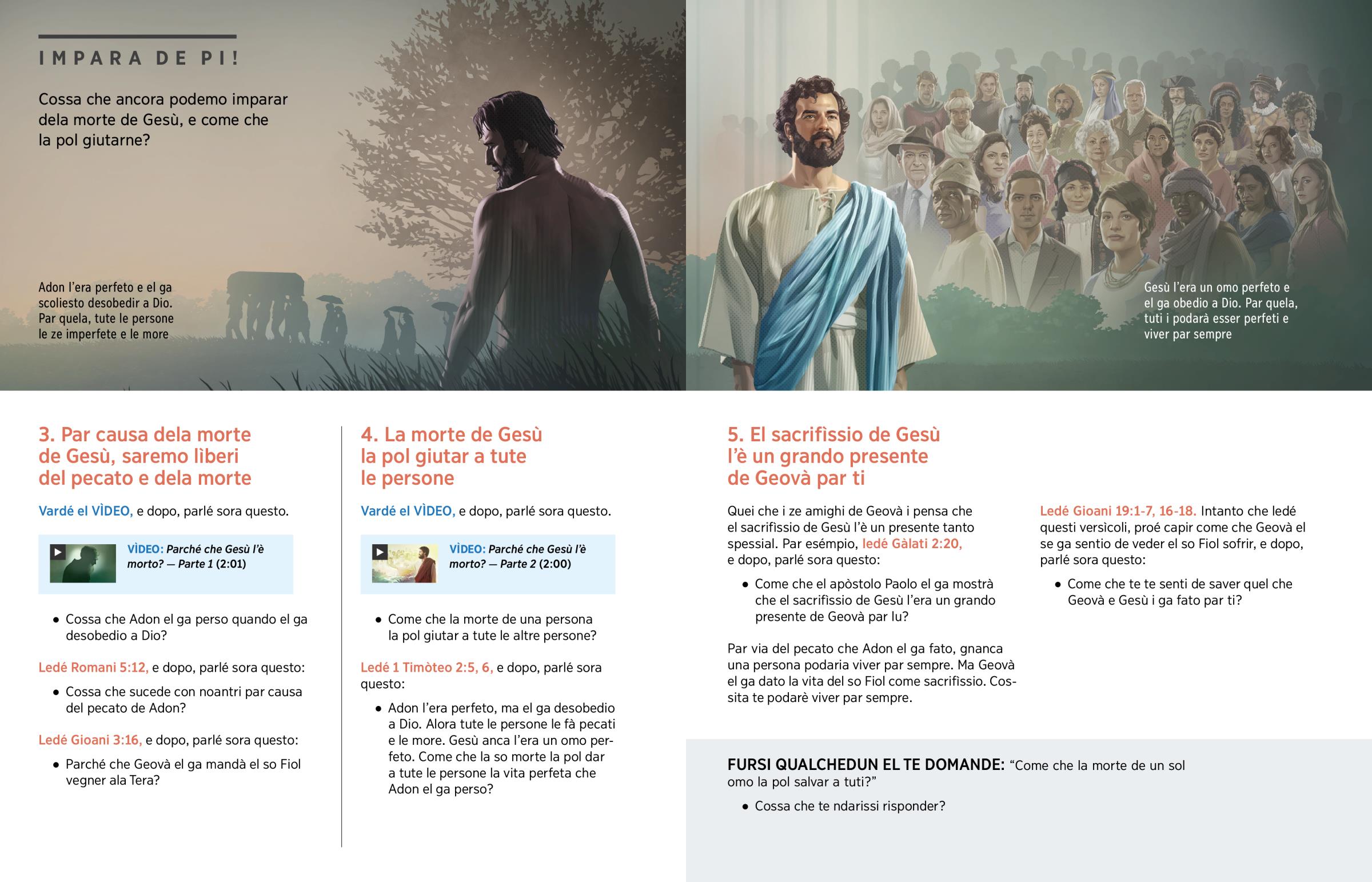 Par via del pecato che Adon el ga fato, gnanca una persona podaria viver par sempre. Ma Geovà el ga dato la vita del so Fiol come sacrifìssio. Cossita te podarè viver par sempre.