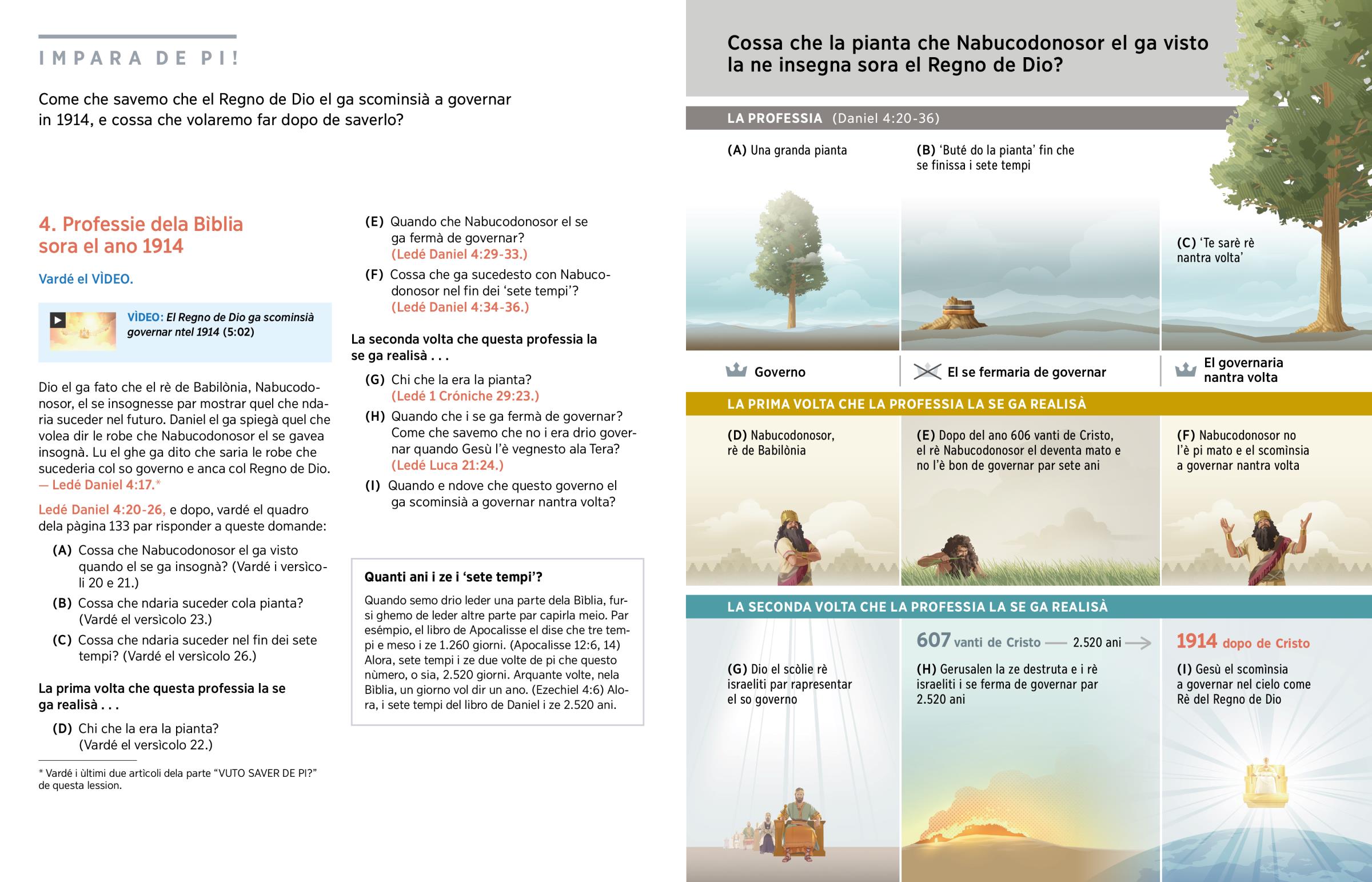 Quando semo drio leder una parte dela Bìblia, fursi ghemo de leder altre parte par capirla meio. Par esémpio, el libro de Apocalisse el dise che tre tempi e meso i ze 1.260 giorni. (Apocalisse 12:6, 14) Alora, sete tempi i ze due volte de pi che questo nùmero, o sia, 2.520 giorni. Arquante volte, nela Bìblia, un giorno vol dir un ano. (Ezechiel 4:6) Alora, i sete tempi del libro de Daniel i ze 2.520 ani.