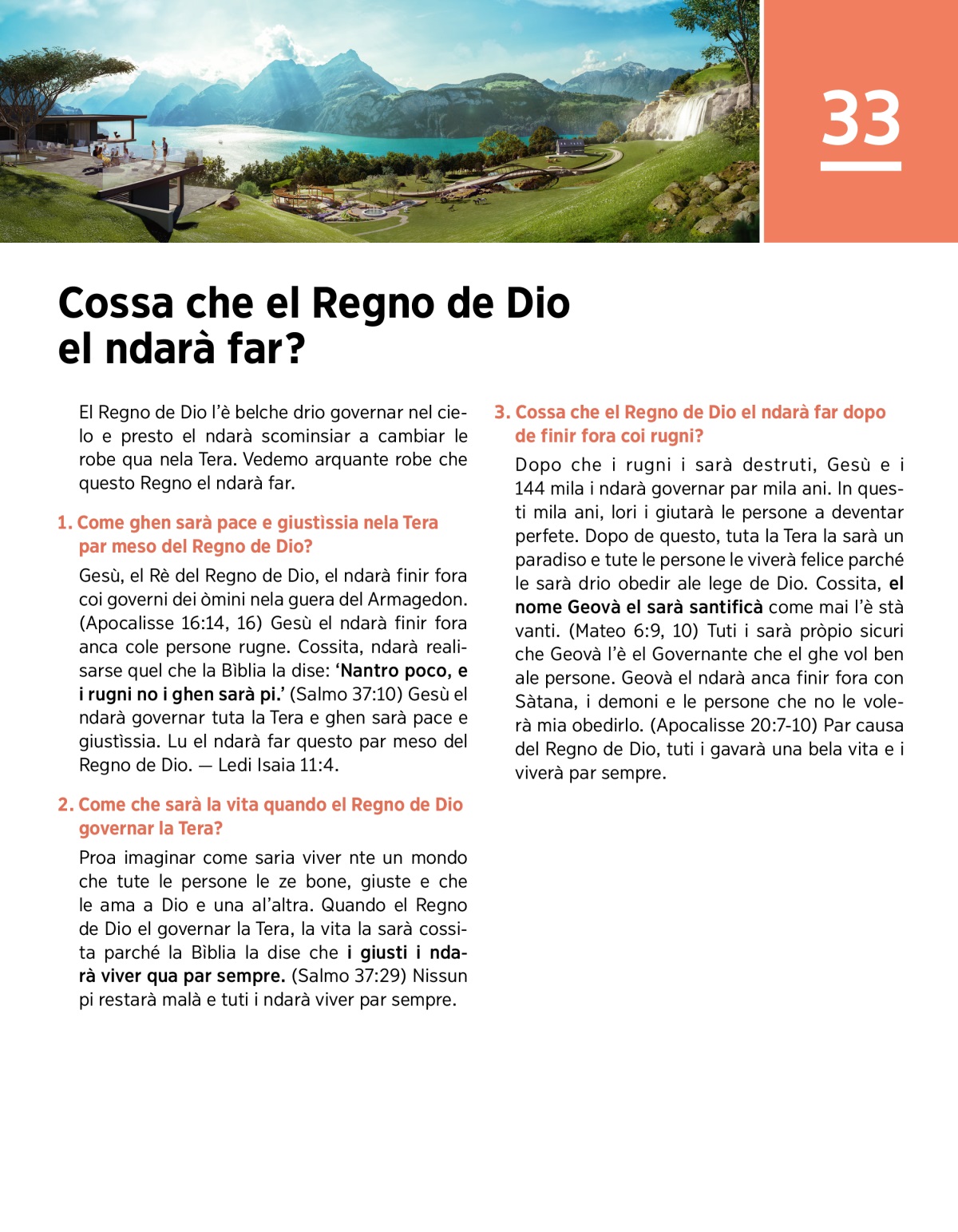 Par meso del so Regno, Dio el ndarà far tuto quel che el ga sempre volesto qua nela Tera. Lu el ndarà far dela Tera un paradiso e le persone bone le ndarà adorarlo e viver par sempre.