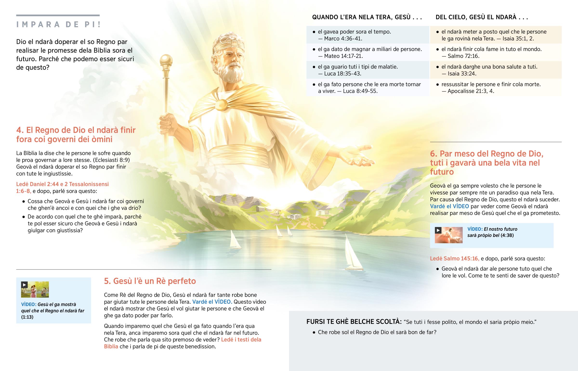 Come Rè del Regno de Dio, Gesù el ndarà far tante robe bone par giutar tute le persone dela Tera. Vardé el VÌDEO. Questo vìdeo el ndarà mostrar che Gesù el vol giutar le persone e che Geovà el ghe ga dato poder par farlo.