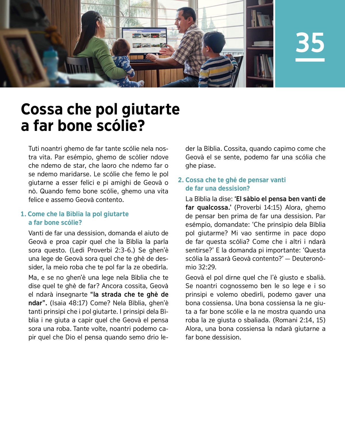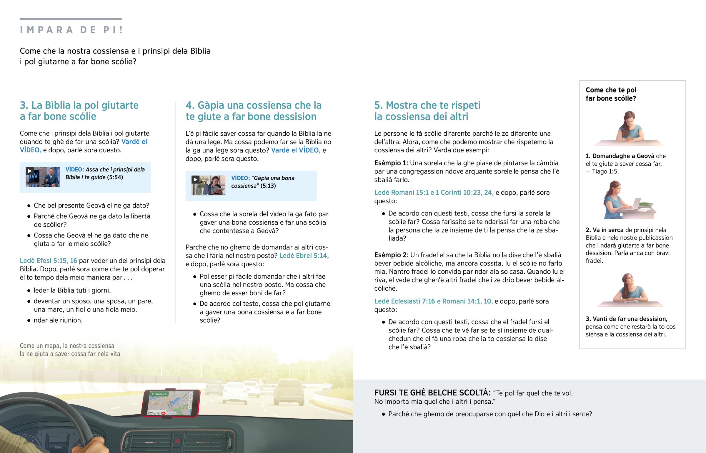 La Bìblia la dise: ‘El sàbio el pensa ben vanti de far qualcossa.’ (Proverbi 14:15) Alora, ghemo de pensar ben prima de far una dessision. Par esémpio, domandate: ‘Che prinsìpio dela Bìblia pol giutarme? Mi vao sentirme in pace dopo de far questa scólia? Come che i altri i ndarà sentirse?’ E la domanda pi importante: ‘Questa scólia la assarà Geovà contento?’ — Deuteronómio 32:29.