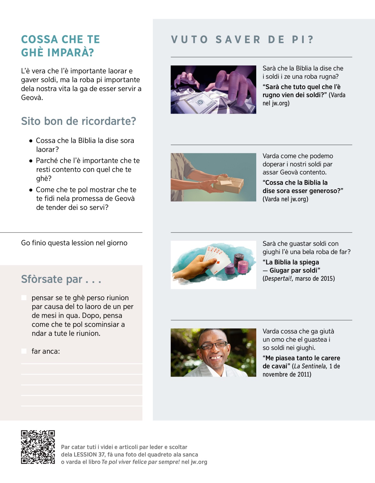 La Bìblia la dise che i soldi i ze una protession. (Eclesiasti 7:12) Ma ela anca la dise che ne ocore de pi che sol i soldi par esser felici. Par quela che la Bìblia la ne insegna che no ghemo de amar i soldi e che ghemo de restar contenti con quel che ghemo. (Ledi Ebrei 13:5.) Se femo cossita, no ndaremo pensar che no ghemo soldi e robe che basta e no ndaremo far dèbiti che no ne ocore. (Proverbi 22:7) E gnanca ndaremo doperar i soldi nei giughi e no cascaremo nela tràpola de ndar drio persone che le dise che podemo restar presto siori sensa laorar tanto.