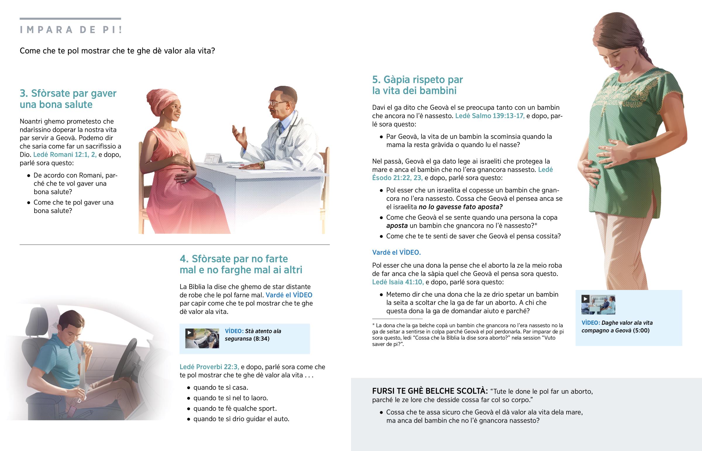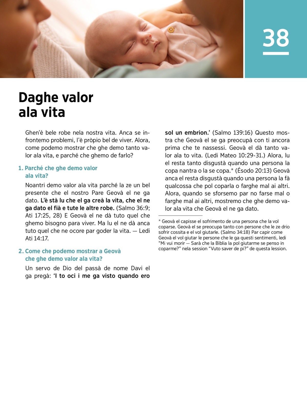 Geovà el ne ga dato un presente tanto bel, che l’è la nostra vita. La Bìblia la ne insegna come amar, proteger e rispetar la nostra vita e la vita dei altri.