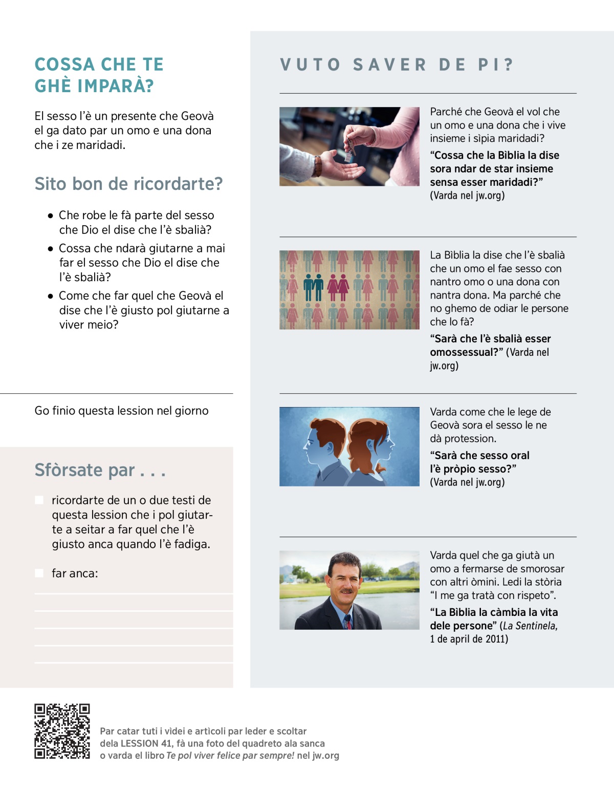 Tante persone le ga vergogna de parlar sora sesso. Magari, la Bìblia la parla sora sesso, ma con rispeto. L’è stà Geovà che el ga scrito la Bìblia e che el ne ga creà. Alora, quel che la Bìblia la dise pol giutarne tanto. Se noantri se sforsemo par far quel che la dise, ndaremo assar Geovà contento e podaremo viver felici par sempre.