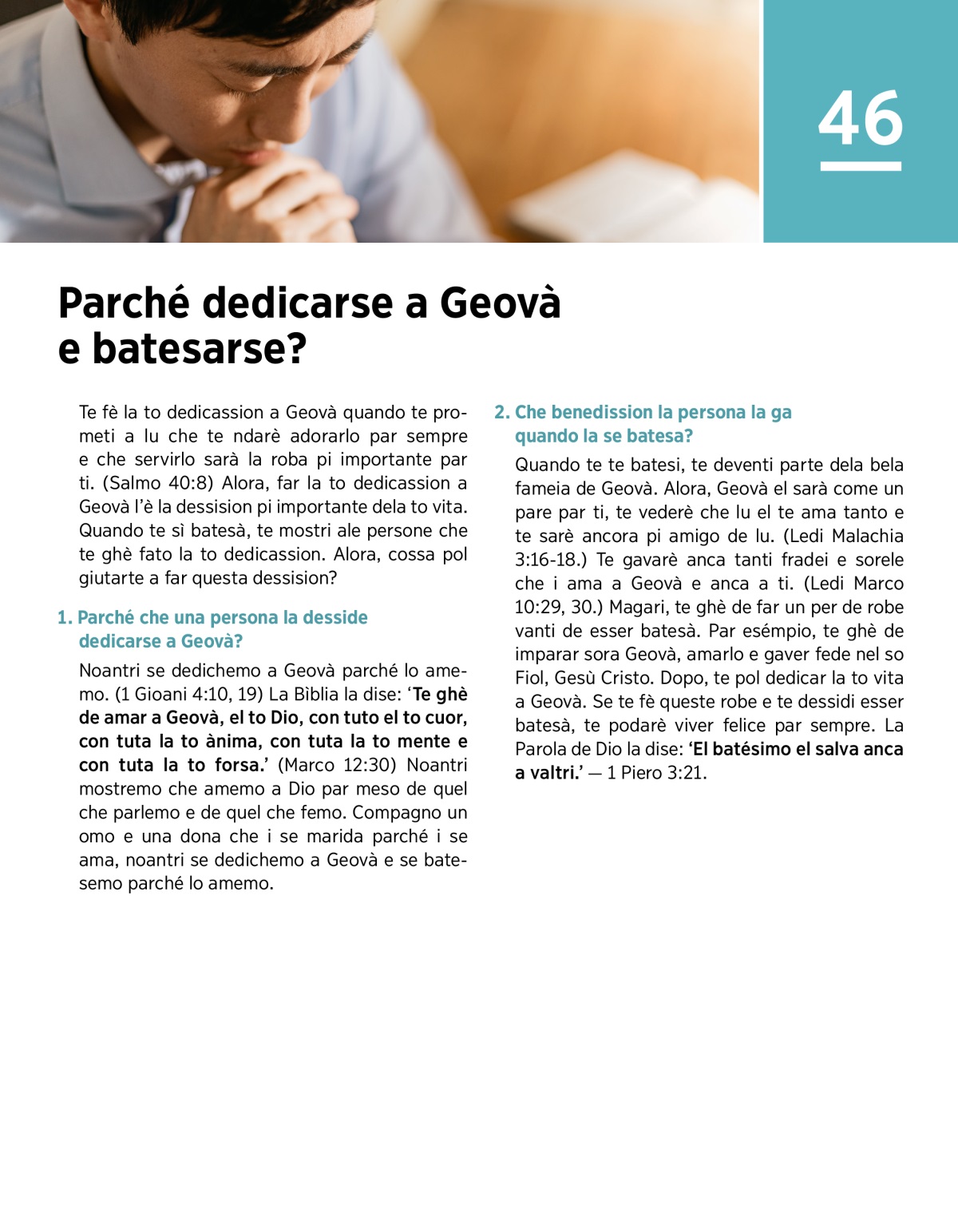 Quando te te batesi, te deventi parte dela bela fameia de Geovà. Alora, Geovà el sarà come un pare par ti, te vederè che lu el te ama tanto e te sarè ancora pi amigo de lu. (Ledi Malachia 3:16-18.) Te gavarè anca tanti fradei e sorele che i ama a Geovà e anca a ti. (Ledi Marco 10:29, 30.) Magari, te ghè de far un per de robe vanti de esser batesà. Par esémpio, te ghè de imparar sora Geovà, amarlo e gaver fede nel so Fiol, Gesù Cristo. Dopo, te pol dedicar la to vita a Geovà. Se te fè queste robe e te dessidi esser batesà, te podarè viver felice par sempre. La Parola de Dio la dise: ‘El batésimo el salva anca a valtri.’ — 1 Piero 3:21.