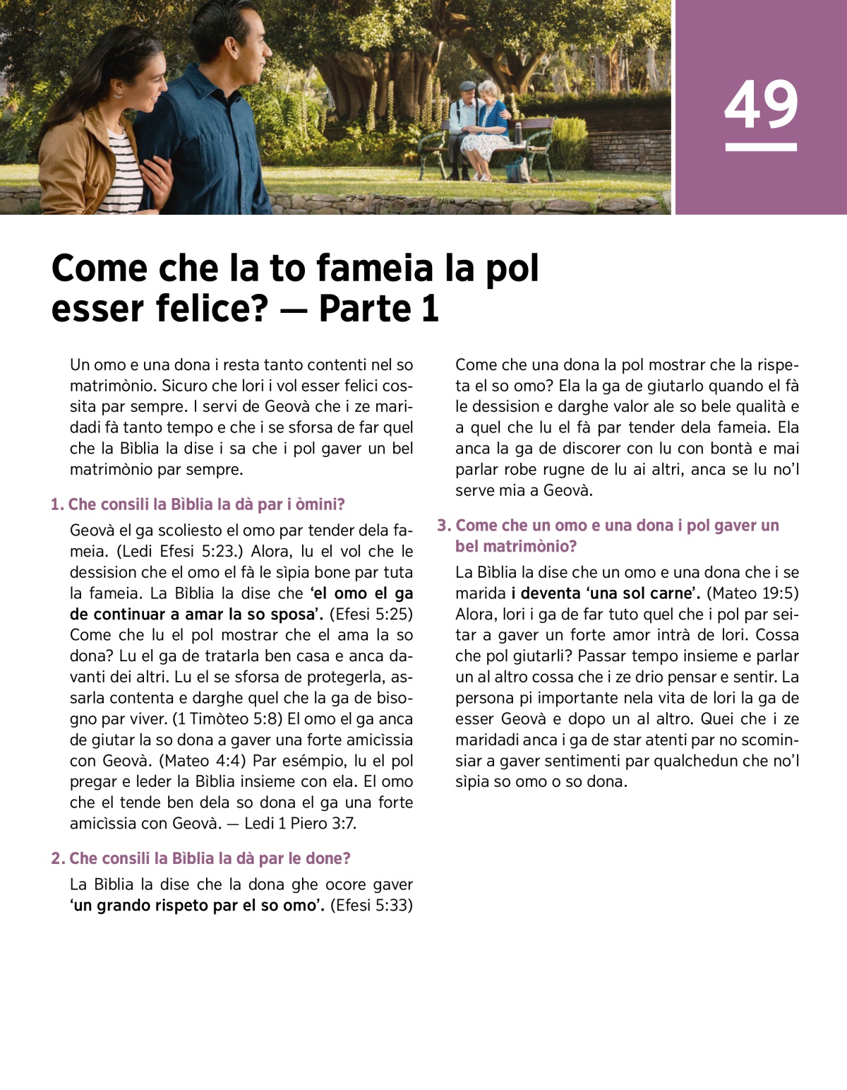 Un omo e una dona i resta tanto contenti nel so matrimònio. Sicuro che lori i vol esser felici cossita par sempre. I servi de Geovà che i ze maridadi fà tanto tempo e che i se sforsa de far quel che la Bìblia la dise i sa che i pol gaver un bel matrimònio par sempre.