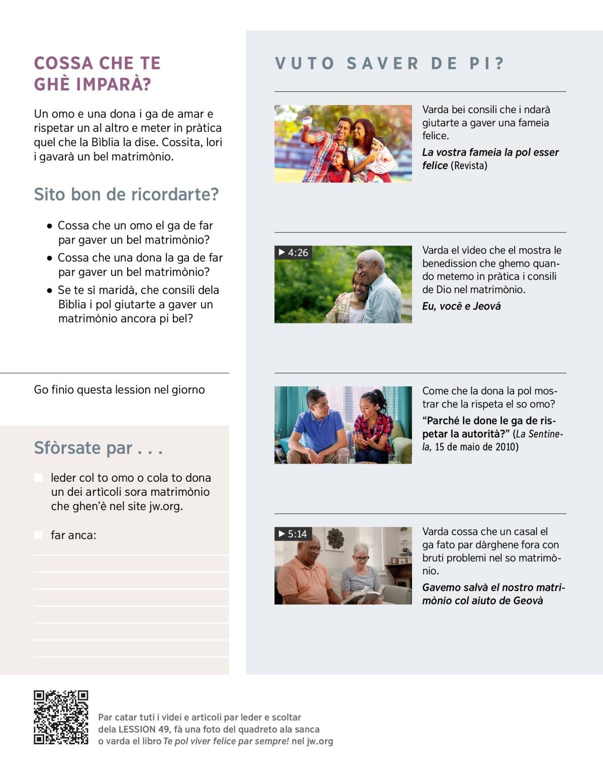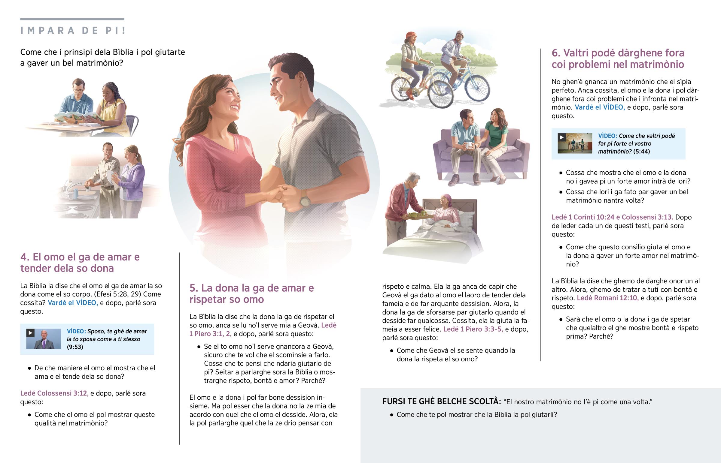 Un omo e una dona i ga de amar e rispetar un al altro e meter in pràtica quel che la Bìblia la dise. Cossita, lori i gavarà un bel matrimònio.
