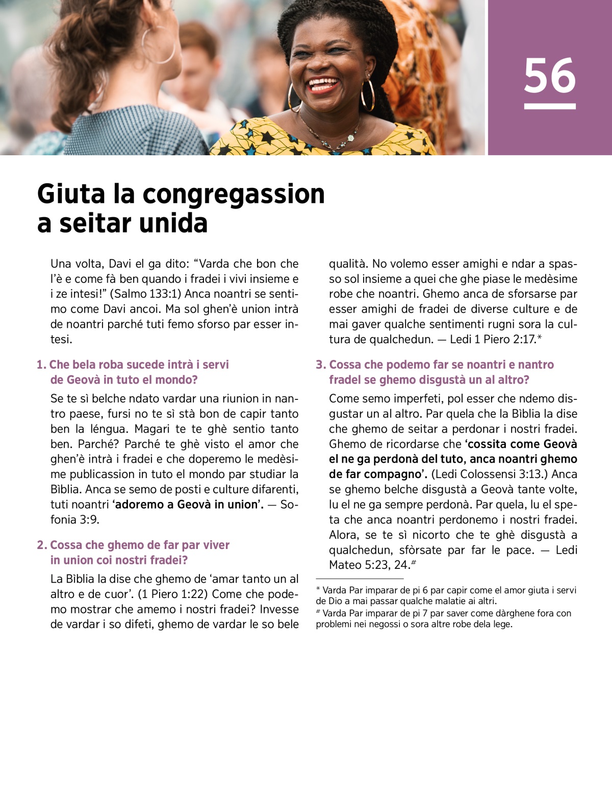 Se te sì belche ndato vardar una riunion in nantro paese, fursi no te sì stà bon de capir tanto ben la léngua. Magari te te ghè sentio tanto ben. Parché? Parché te ghè visto el amor che ghen’è intrà i fradei e che doperemo le medèsime publicassion in tuto el mondo par studiar la Bìblia. Anca se semo de posti e culture difarenti, tuti noantri ‘adoremo a Geovà in union’. — Sofonia 3:9.