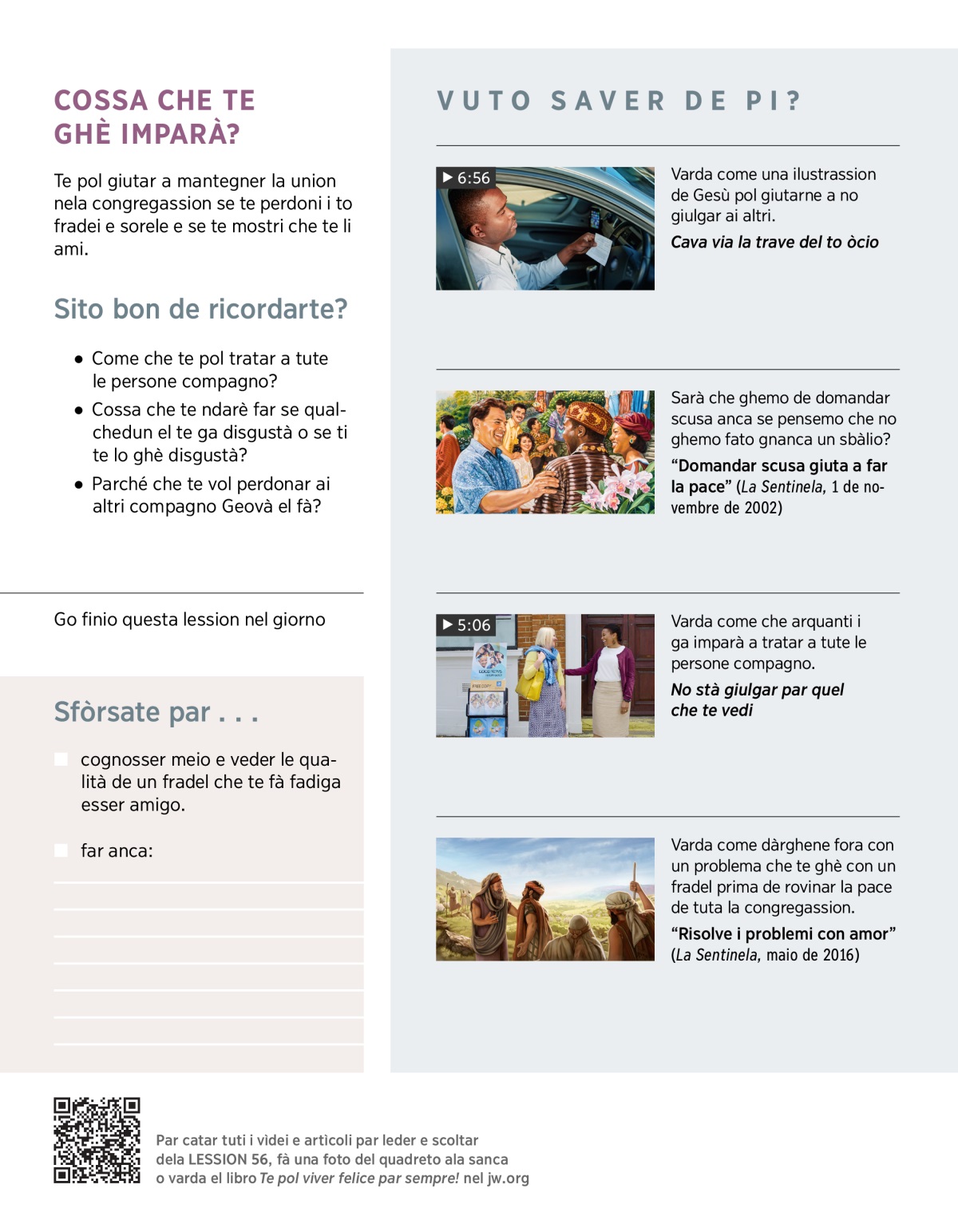 Come semo imperfeti, pol esser che ndemo disgustar un al altro. Par quela che la Bìblia la dise che ghemo de seitar a perdonar i nostri fradei. Ghemo de ricordarse che ‘cossita come Geovà el ne ga perdonà del tuto, anca noantri ghemo de far compagno’. (Ledi Colossensi 3:13.) Anca se ghemo belche disgustà a Geovà tante volte, lu el ne ga sempre perdonà. Par quela, lu el speta che anca noantri perdonemo i nostri fradei. Alora, se te sì nicorto che te ghè disgustà a qualchedun, sfòrsate par far le pace. — Ledi Mateo 5:23, 24.b