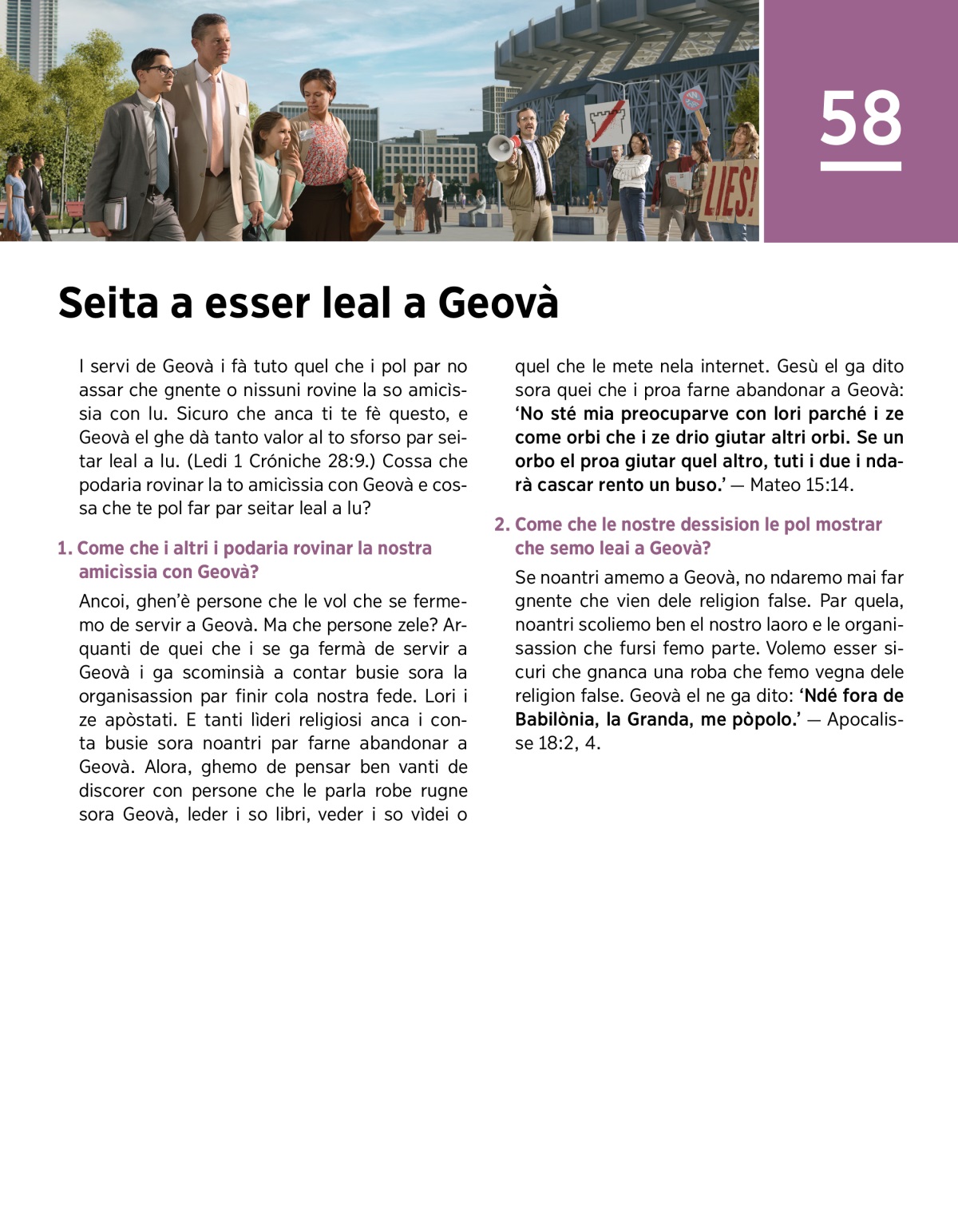 Come mostra el versìcolo, se savemo che qualchedun nela congregassion l’è drio far un bruto pecato, ne ocore contar ai ansiani. Prima de farlo, saria meio che domandessino che el ndesse lu parlar del so pecato ai ansiani. Ma, se lu no’l fà cossita, mostremo che semo leai a Geovà se parlemo noantri quel che savemo ai ansiani. Parché che far questo mostra che semo leai . . .