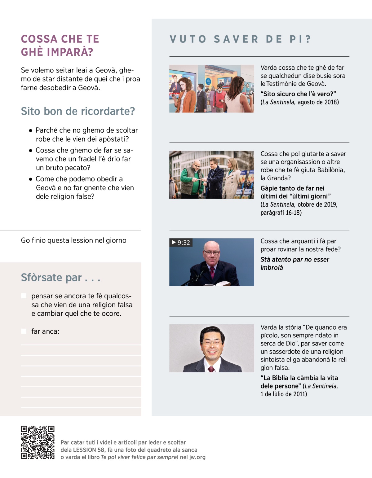 Se noantri amemo a Geovà, no ndaremo mai far gnente che vien dele religion false. Par quela, noantri scoliemo ben el nostro laoro e le organisassion che fursi femo parte. Volemo esser sicuri che gnanca una roba che femo vegna dele religion false. Geovà el ne ga dito: ‘Ndé fora de Babilònia, la Granda, me pòpolo.’ — Apocalisse 18:2, 4.