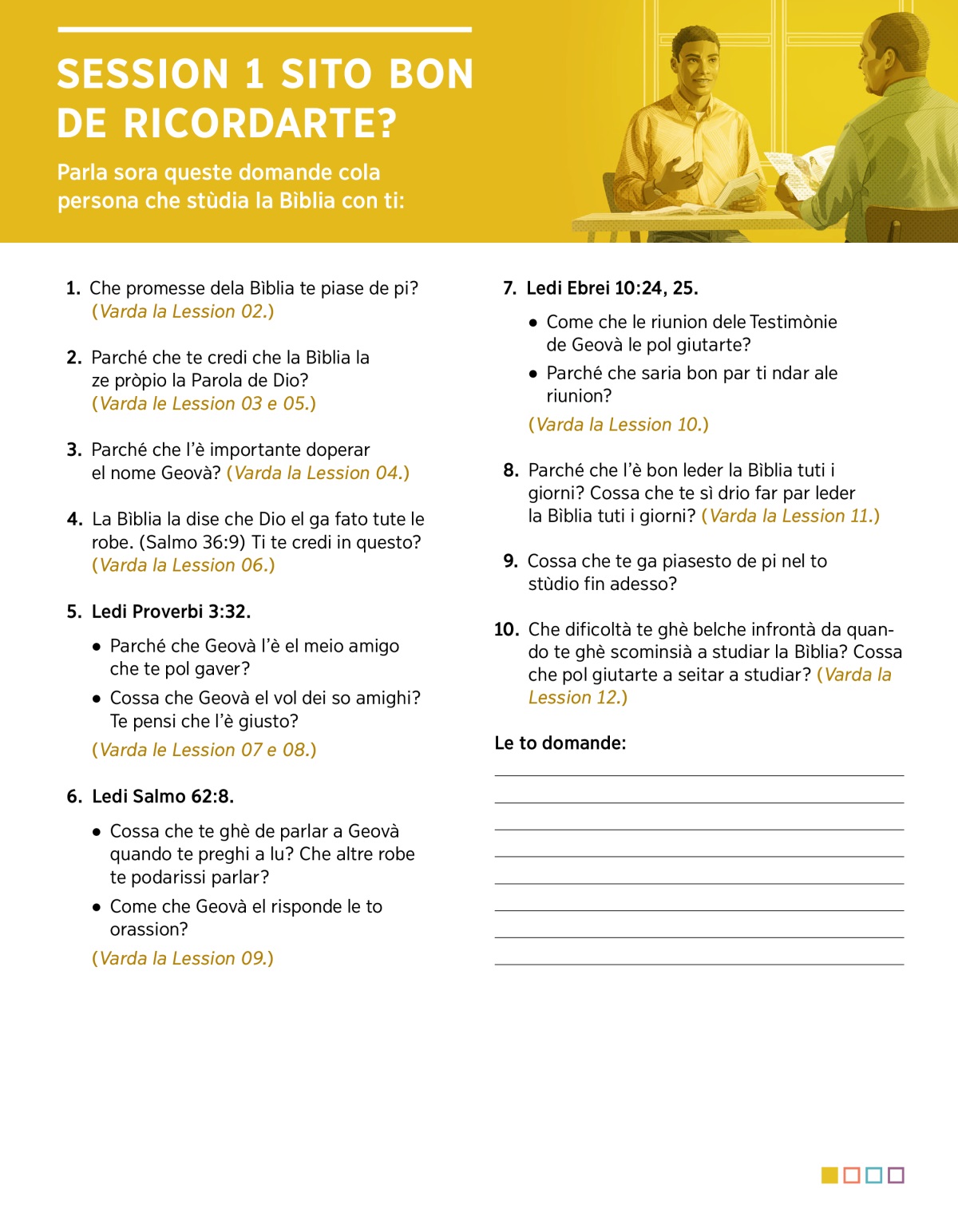 Parla sora queste domande cola persona che stùdia la Bìblia con ti:
