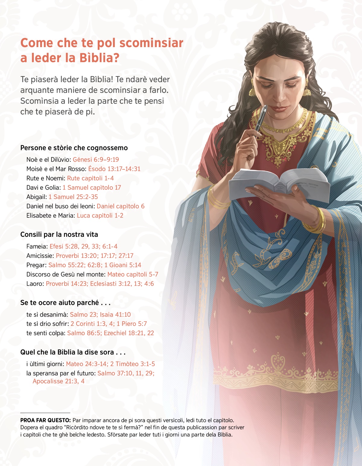 Te piaserà leder la Bìblia! Te ndarè veder arquante maniere de scominsiar a farlo. Scomìnsia a leder la parte che te pensi che te piaserà de pi.