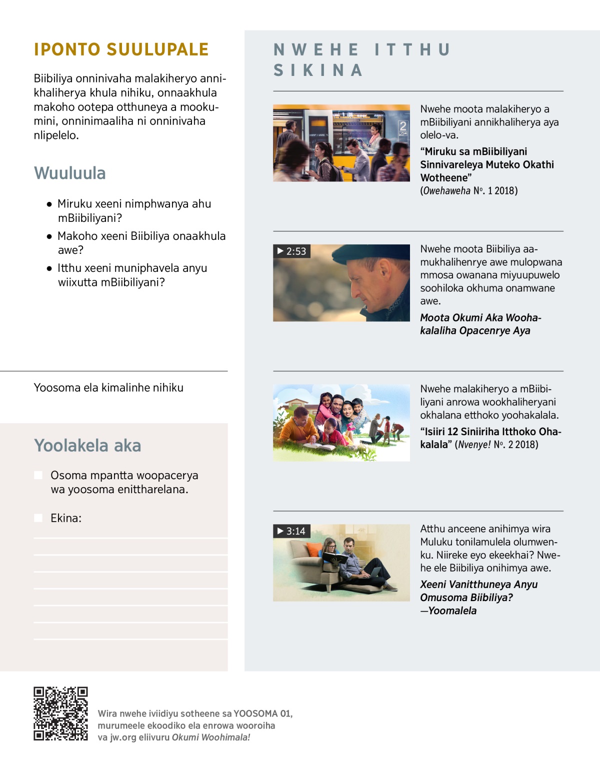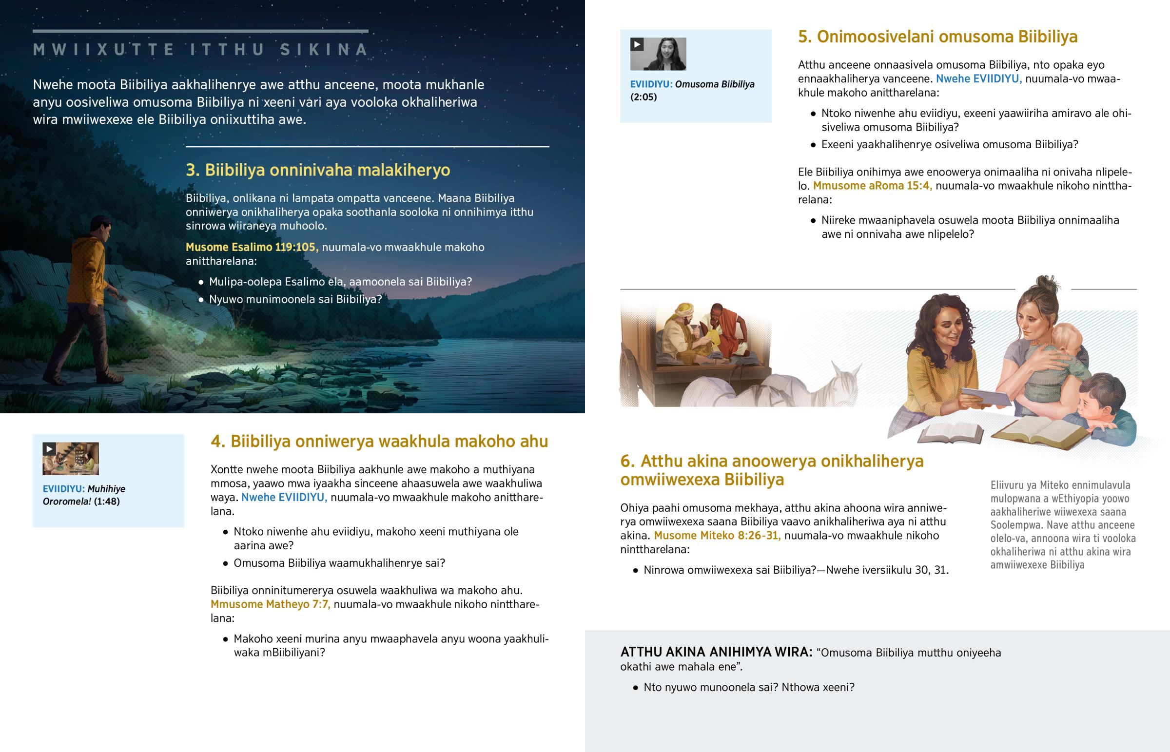 Atthu anceene onnaasivela omusoma Biibiliya, nto opaka eyo ennaakhaliherya vanceene. Nwehe EVIIDIYU, nuumala-vo mwaakhule makoho anittharelana: