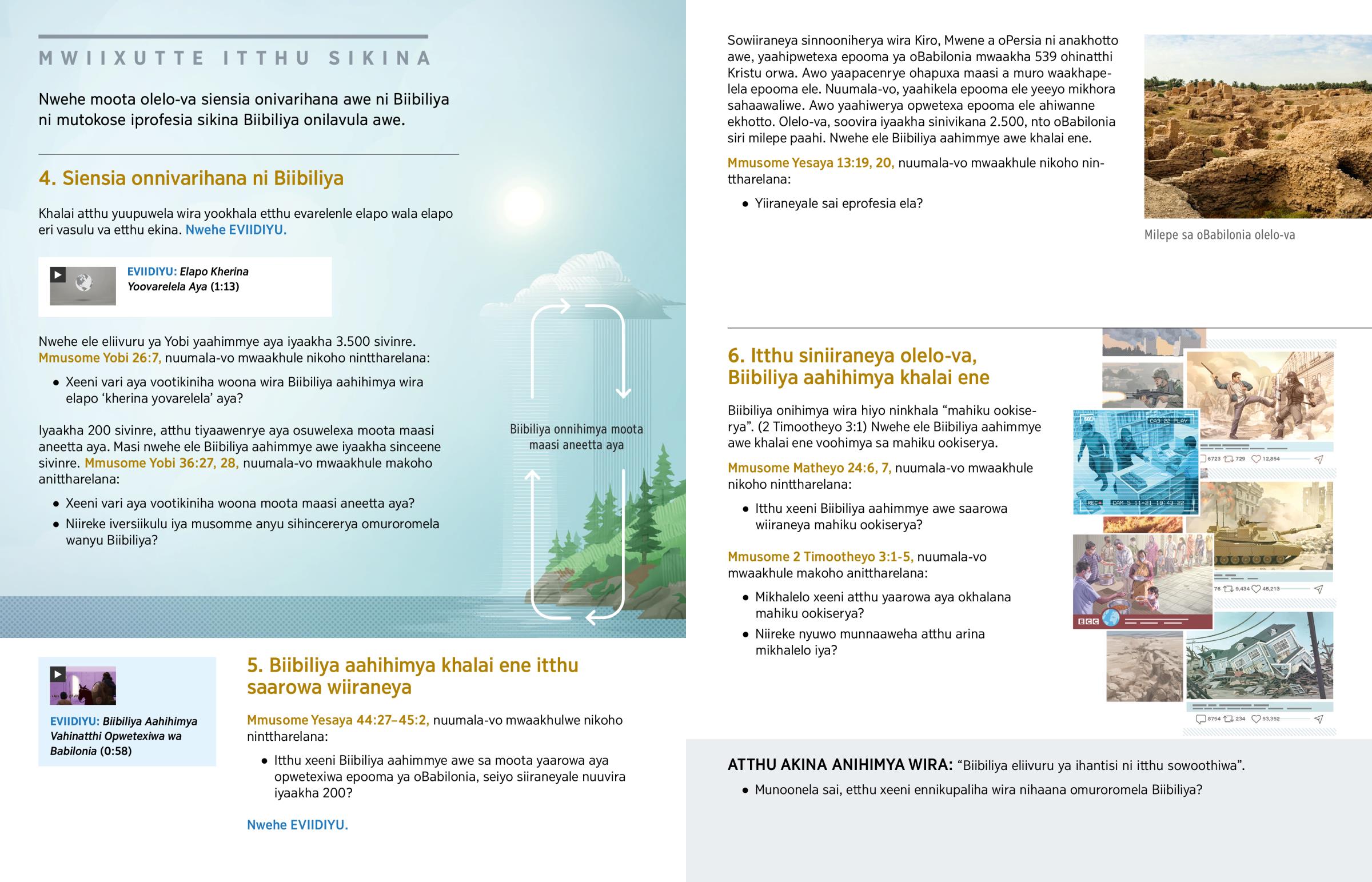 Biibiliya ookhalana iprofesiaa sinlavula itthu “sinrowa wiraneya” muhoolo. (Yesaya 46:10) Mwa ntakiheryo, sookhala itthu sinceene siiraneyale seiyo Biibiliya aahimmye awe khalai ene wira saamwiiraneya. Nave Biibiliya aahihimya khalai ene makhalelo a olumwenku mahiku ahu ala. Nto yoosoma ela, ninrowa oweha iprofesia vakhaani Biibiliya onilavula awe. Etthu yoohakalaliha oweha wira itthu Biibiliya aahimmye awe khalai ene sinniiraneya!