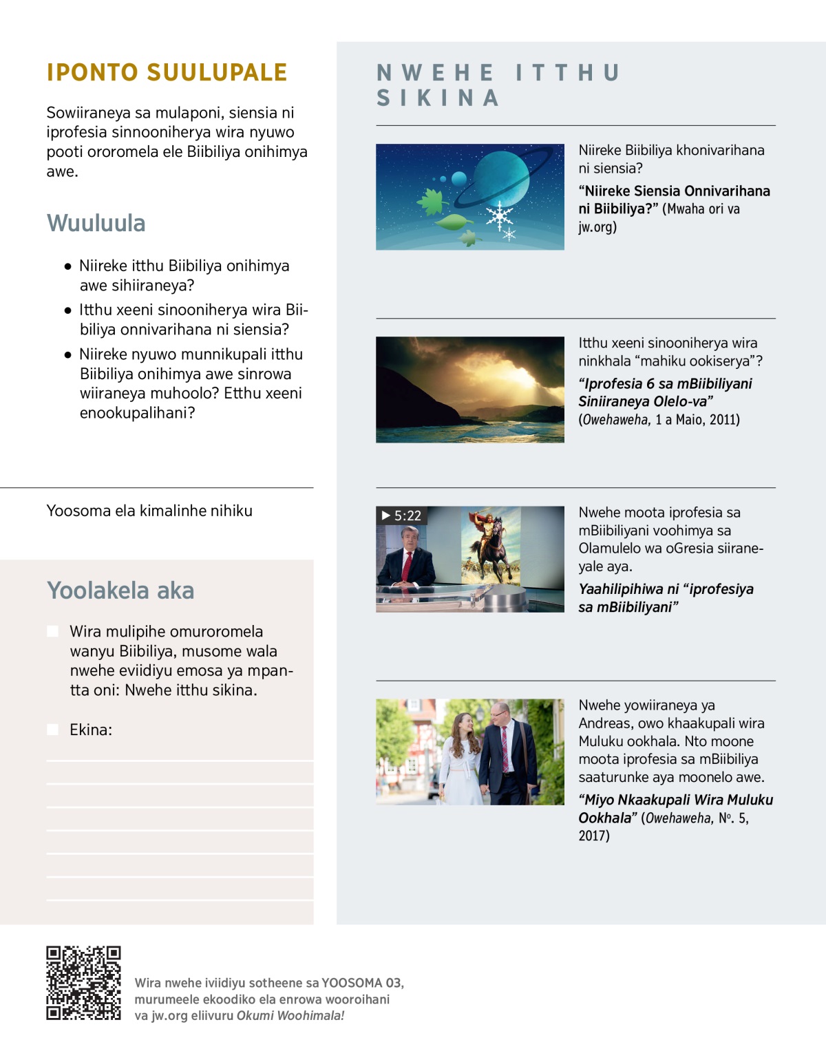 Biibiliya onnilavula itthu sinceene sooloka sinrowa wiiraneya muhoolo. Nave onnivaha miruku sooloka. Woonasa wene, nyuwo munniphavela osuwela ele onihimya awe. Masi pooti wira sookhala itthu munaanyiherya anyu. Nto niireke nyuwo pooti ororomela sooleiherya ni miruku sa eliivuru ya khalai? Niireke ti vooloka okupali ele Biibiliya onihimya awe wira muhoolo nnookhalana okumi woohakalaliha? Atthu anceene annikupali wira nnookhalana okumi woohakalaliha. Niireke nyuwo nave pooti okupali eyo? Nrowe niwehe.