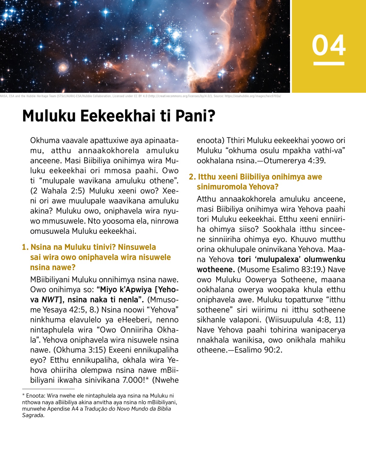a Wira nwehe ele nintaphulela aya nsina na Muluku ni nthowa naya aBiibiliya akina anvitha aya nsina nlo mBiibiliyani, munwehe Apendise A4 a Tradução do Novo Mundo da Bíblia Sagrada.