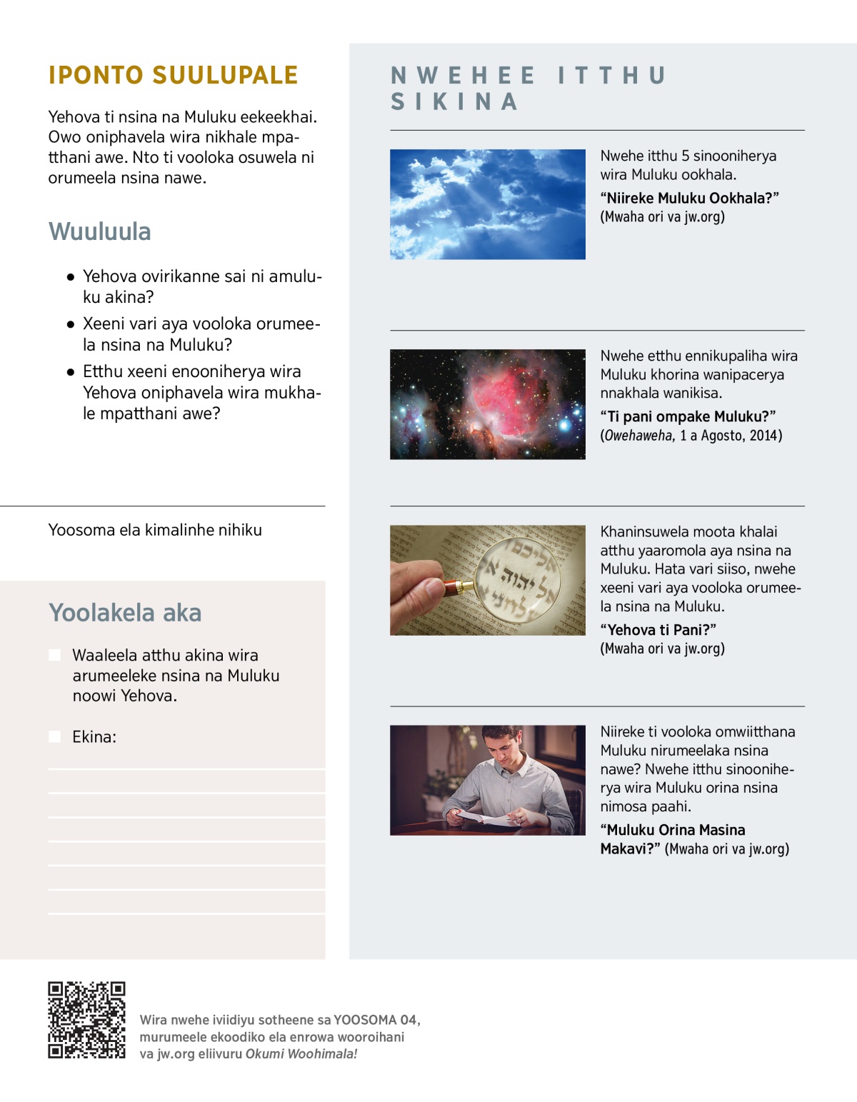 Nwehe ovirikana okhanle maihaneliwo a nttittimiho a Muluku ni nsina nawe. Nave nwehe moota Yehova oosuwelinhaaweni nsina nawe ni nthowa nimwiirinhe woosuwelihani.