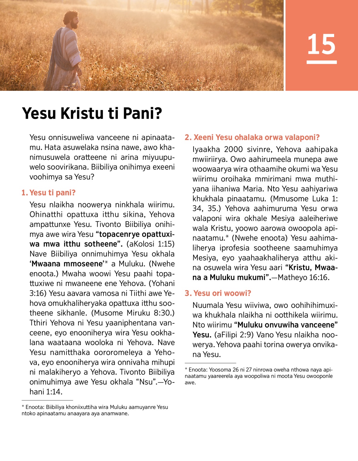 Iyaakha 2000 sivinre, Yehova aahipaka mwiiriirya. Owo aahirumeela munepa awe woowaarya wira othaamihe okumi wa Yesu wiirimu oroihaka mmirimani mwa muthiyana iihaniwa Maria. Nto Yesu aahiyariwa khukhala pinaatamu. (Mmusome Luka 1:34, 35.) Yehova aahimuruma Yesu orwa valaponi wira okhale Mesiya aaleiheriwe wala Kristu, yoowo aarowa owoopola apinaatamu.b (Nwehe enoota) Yesu aahimaliherya iprofesia sootheene saamuhimya Mesiya, eyo yaahaakhaliherya atthu akina osuwela wira Yesu aari “Kristu, Mwaana a Muluku mukumi”.—Matheyo 16:16.