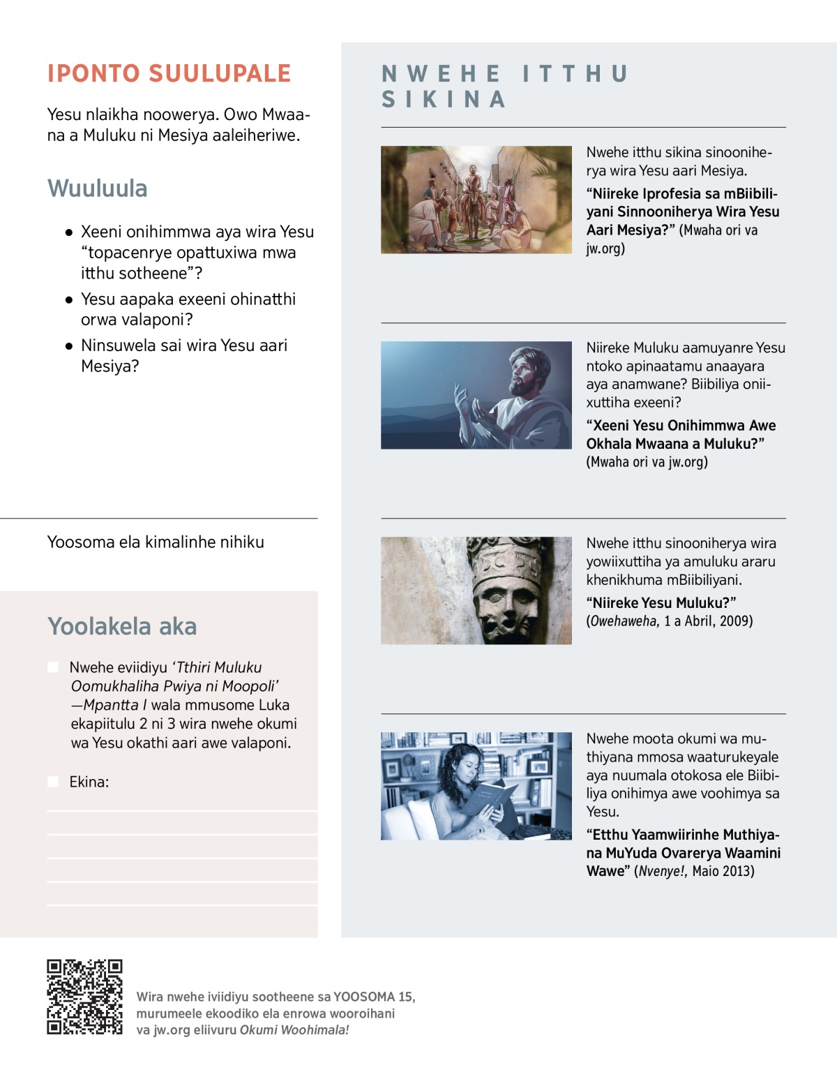 “Niireke Iprofesia sa mBiibiliyani Sinnooniherya Wira Yesu Aari Mesiya?” (Mwaha ori va jw.org)