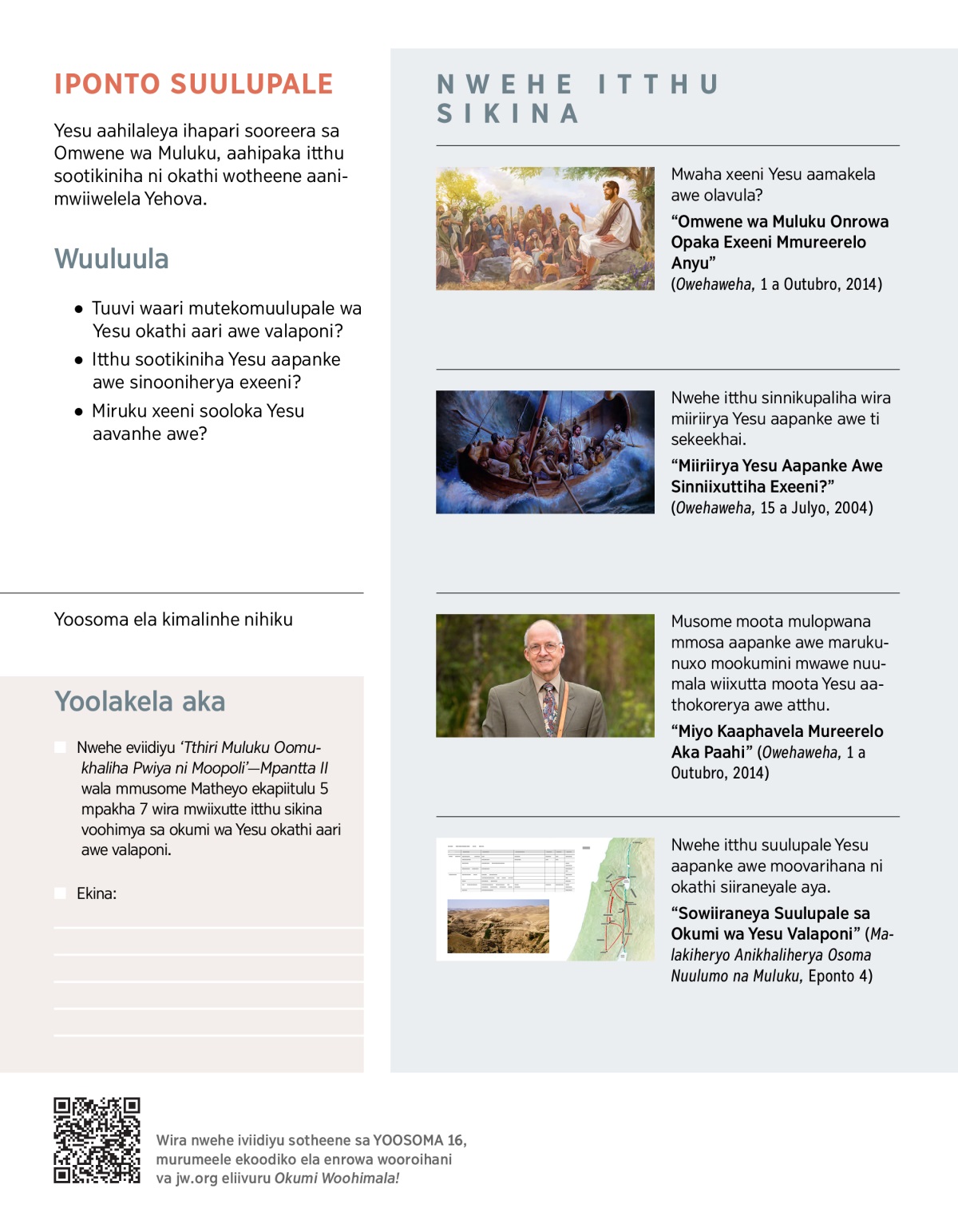 Okathi atthu akina animuupuwela aya Yesu, awo animuupuwela mwaana, profeta a ankhili wala mulopwana aahaala okhwa. Masi ninniixutta itthu sinceene vaavo ninthokorerya ahu okumi wa Yesu okathi aari awe valaponi. Yoosoma ela, ninrowa oweha itthu vakhaani sa faita Yesu aapanke awe ni moota itthu iyo sikhanle aya oonikhaliherya.