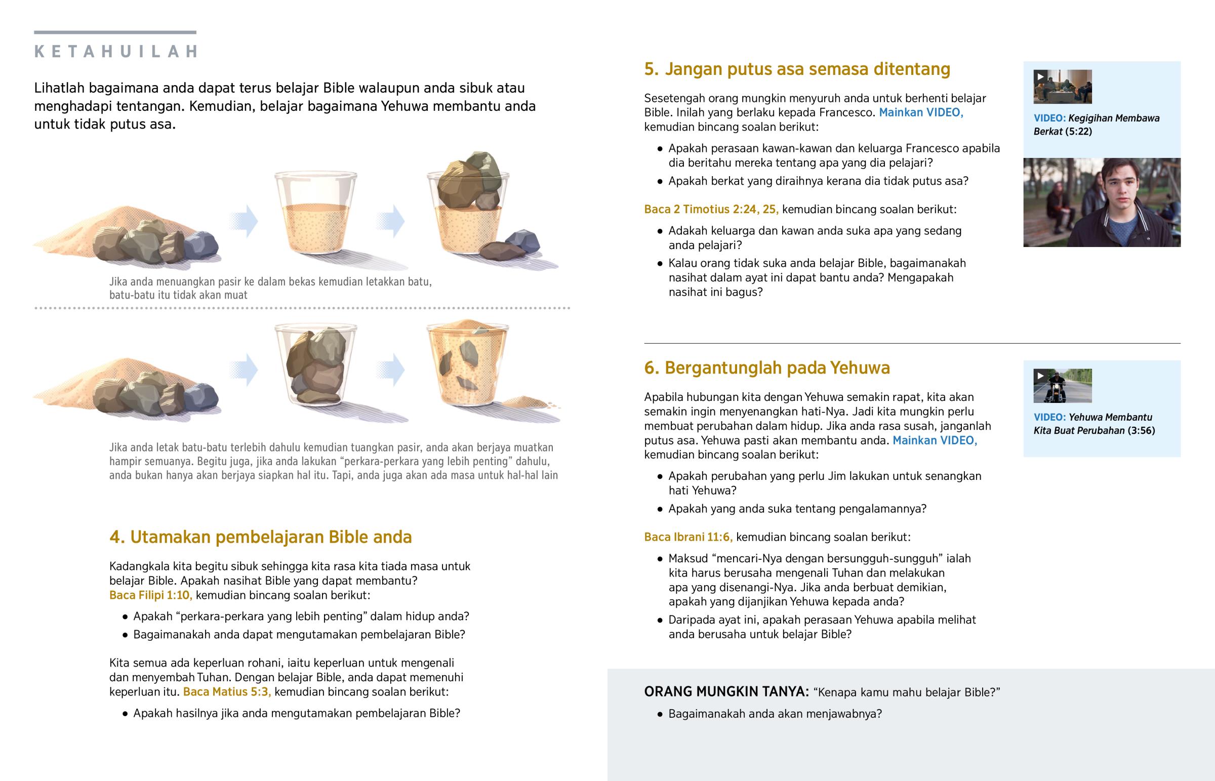 Lihatlah bagaimana anda dapat terus belajar Bible walaupun anda sibuk atau menghadapi tentangan. Kemudian, belajar bagaimana Yehuwa membantu anda untuk tidak putus asa.