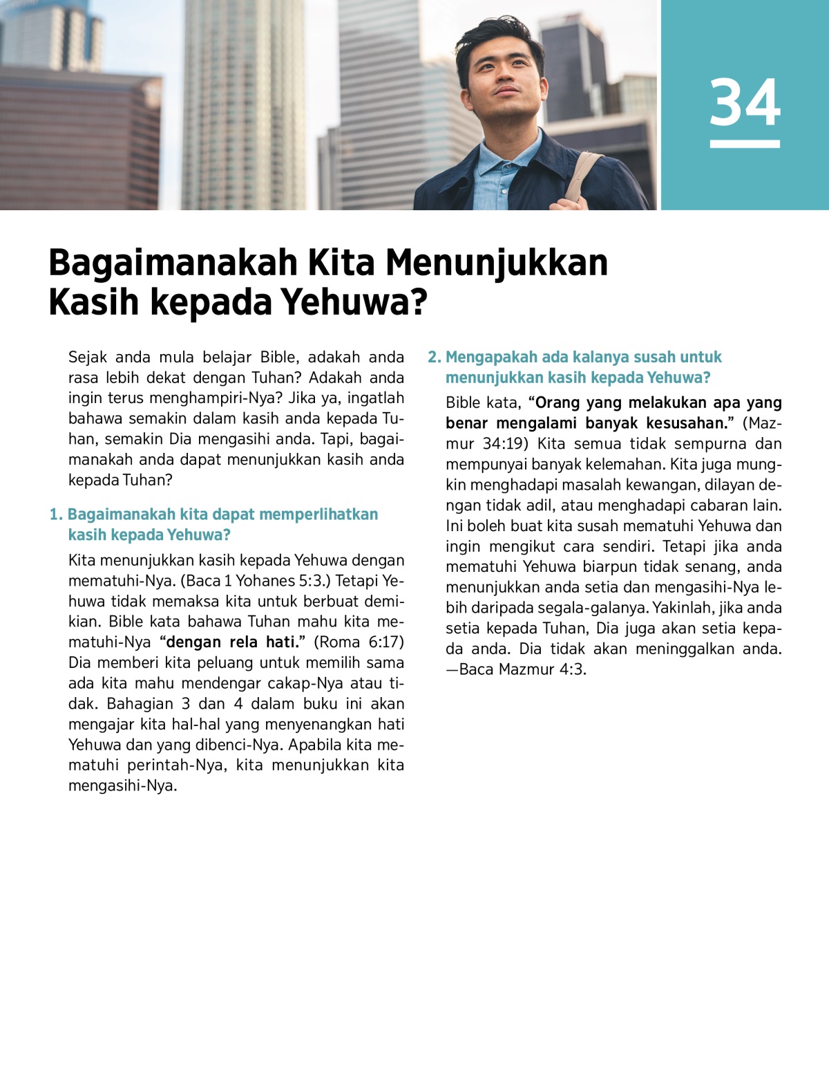 Kita menunjukkan kasih kepada Yehuwa dengan mematuhi-Nya. (Baca 1 Yohanes 5:3.) Tetapi Yehuwa tidak memaksa kita untuk berbuat demikian. Bible kata bahawa Tuhan mahu kita mematuhi-Nya “dengan rela hati.” (Roma 6:17) Dia memberi kita peluang untuk memilih sama ada kita mahu mendengar cakap-Nya atau tidak. Bahagian 3 dan 4 dalam buku ini akan mengajar kita hal-hal yang menyenangkan hati Yehuwa dan yang dibenci-Nya. Apabila kita mematuhi perintah-Nya, kita menunjukkan kita mengasihi-Nya.