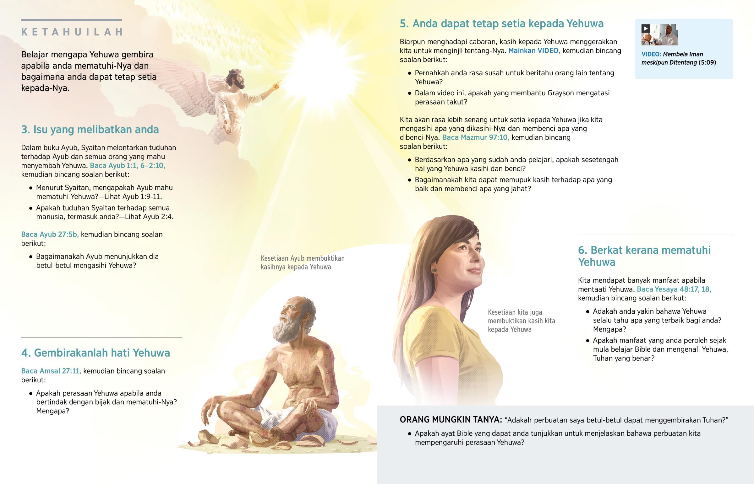 Dalam buku Ayub, Syaitan melontarkan tuduhan terhadap Ayub dan semua orang yang mahu menyembah Yehuwa. Baca Ayub 1:1, 6–2:10, kemudian bincang soalan berikut: