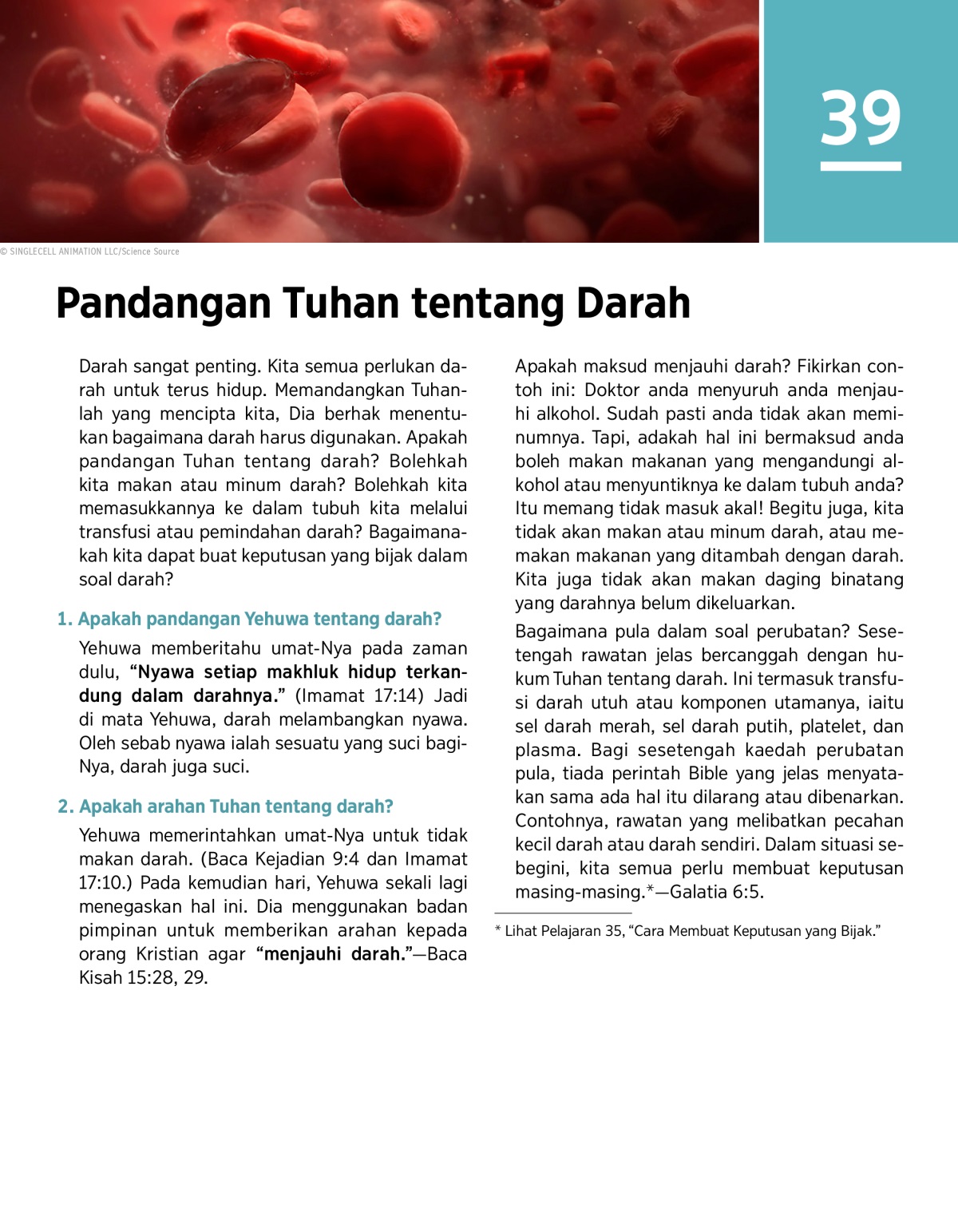 Darah sangat penting. Kita semua perlukan darah untuk terus hidup. Memandangkan Tuhanlah yang mencipta kita, Dia berhak menentukan bagaimana darah harus digunakan. Apakah pandangan Tuhan tentang darah? Bolehkah kita makan atau minum darah? Bolehkah kita memasukkannya ke dalam tubuh kita melalui transfusi atau pemindahan darah? Bagaimanakah kita dapat buat keputusan yang bijak dalam soal darah?