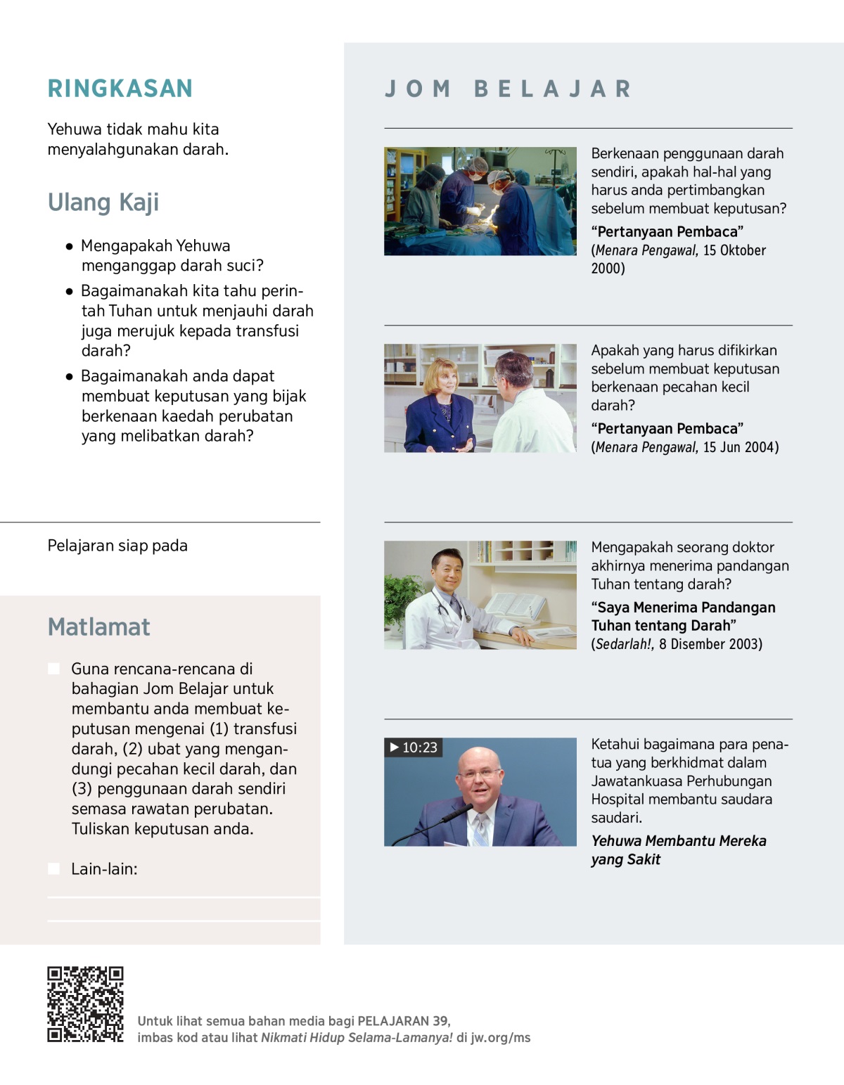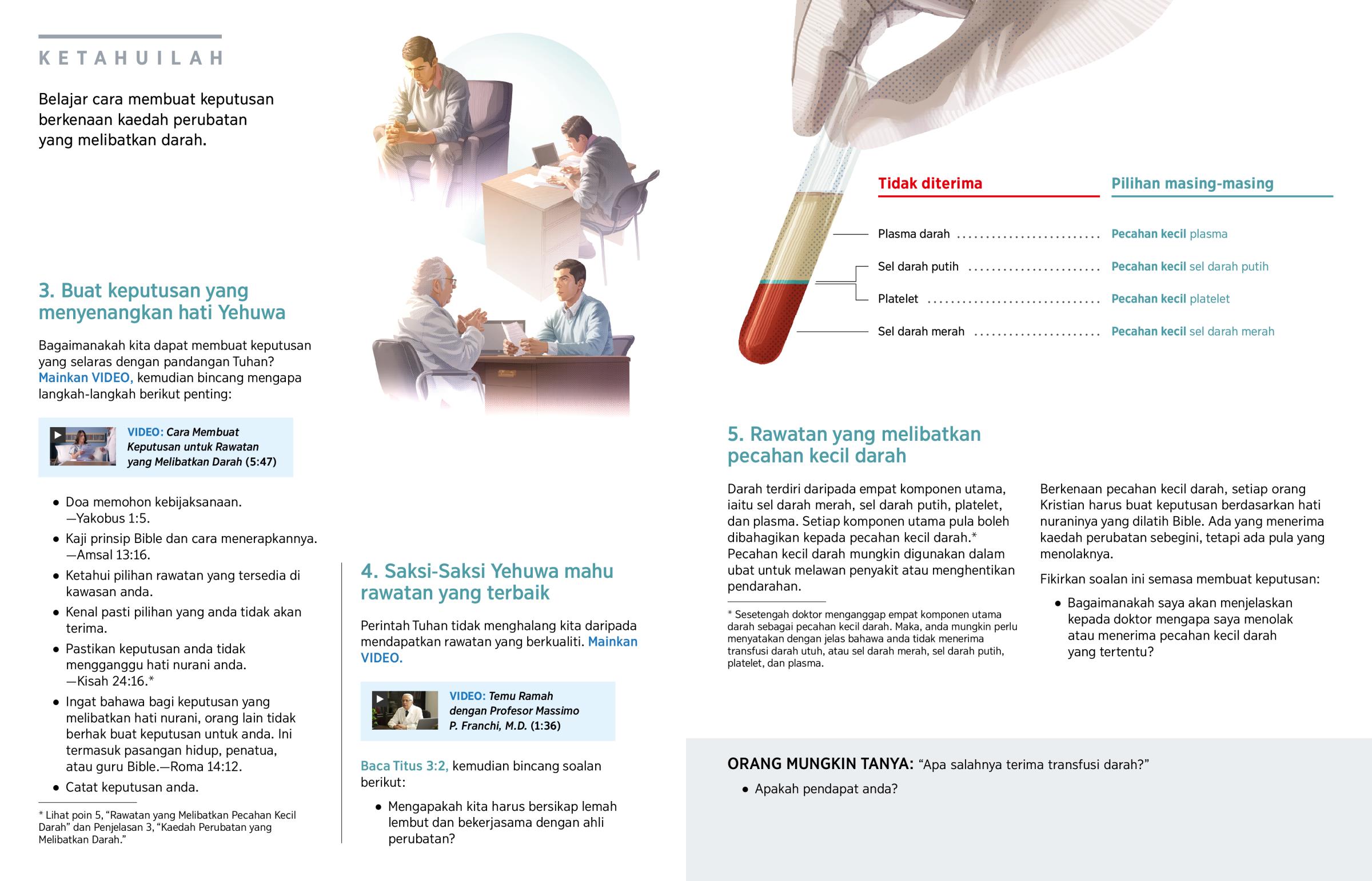 Bagaimana pula dalam soal perubatan? Sesetengah rawatan jelas bercanggah dengan hukum Tuhan tentang darah. Ini termasuk transfusi darah utuh atau komponen utamanya, iaitu sel darah merah, sel darah putih, platelet, dan plasma. Bagi sesetengah kaedah perubatan pula, tiada perintah Bible yang jelas menyatakan sama ada hal itu dilarang atau dibenarkan. Contohnya, rawatan yang melibatkan pecahan kecil darah atau darah sendiri. Dalam situasi sebegini, kita semua perlu membuat keputusan masing-masing.a—Galatia 6:5.