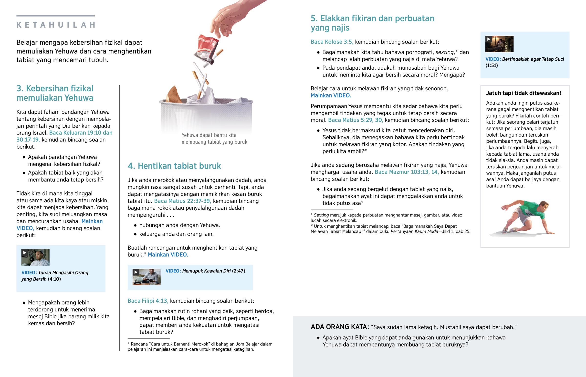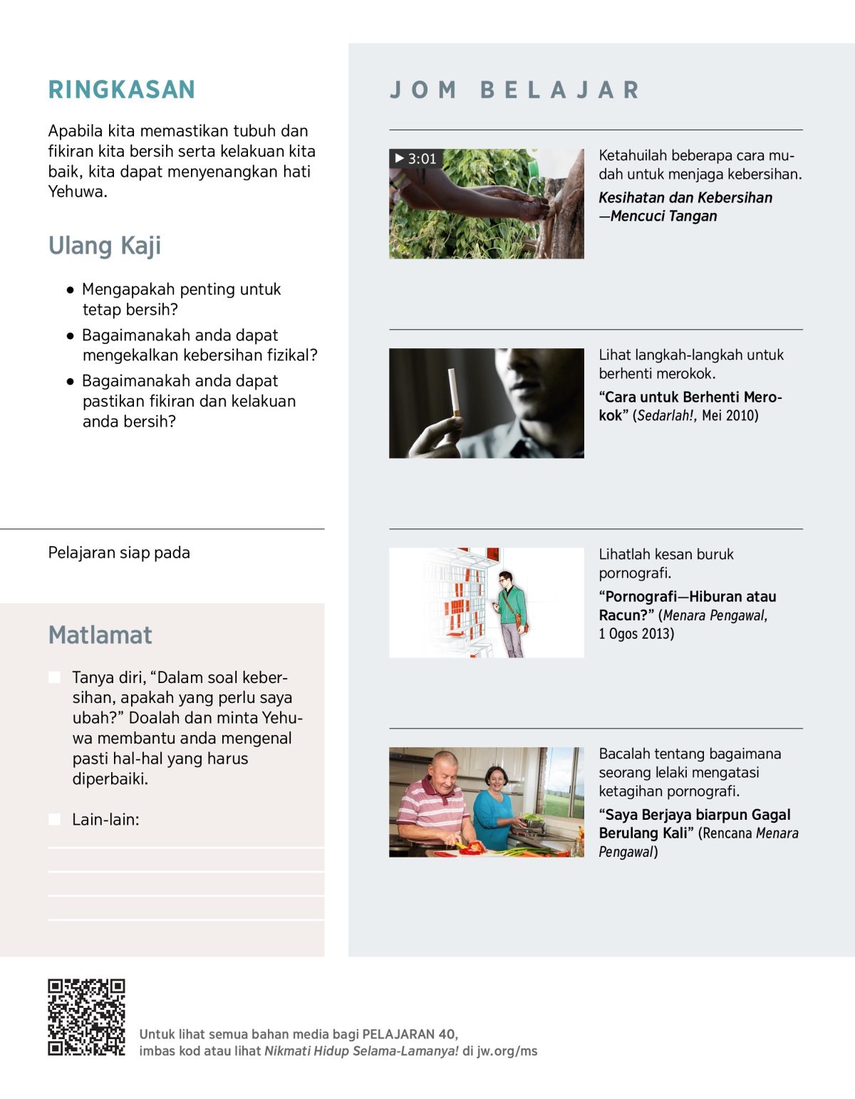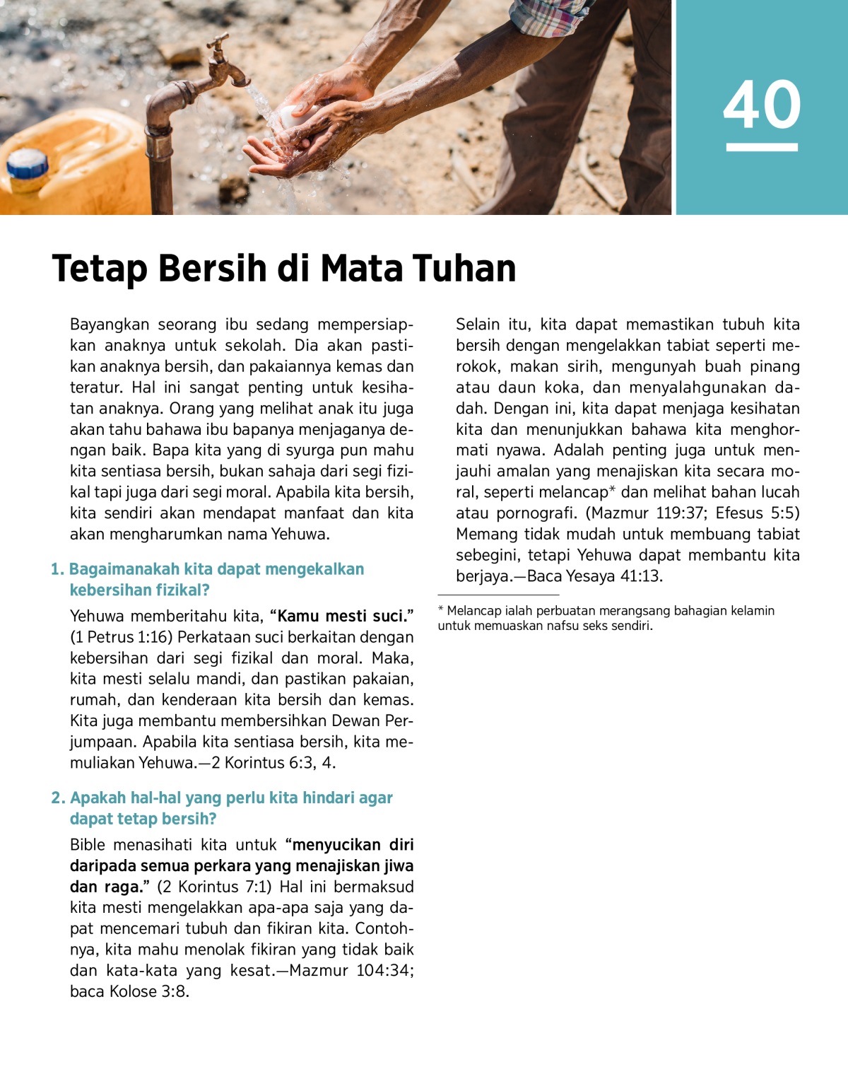 Bayangkan seorang ibu sedang mempersiapkan anaknya untuk sekolah. Dia akan pastikan anaknya bersih, dan pakaiannya kemas dan teratur. Hal ini sangat penting untuk kesihatan anaknya. Orang yang melihat anak itu juga akan tahu bahawa ibu bapanya menjaganya dengan baik. Bapa kita yang di syurga pun mahu kita sentiasa bersih, bukan sahaja dari segi fizikal tapi juga dari segi moral. Apabila kita bersih, kita sendiri akan mendapat manfaat dan kita akan mengharumkan nama Yehuwa.