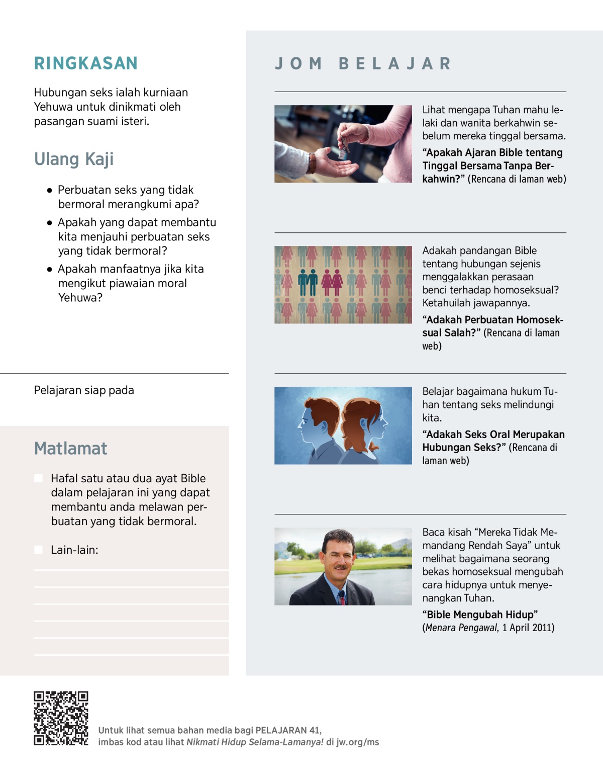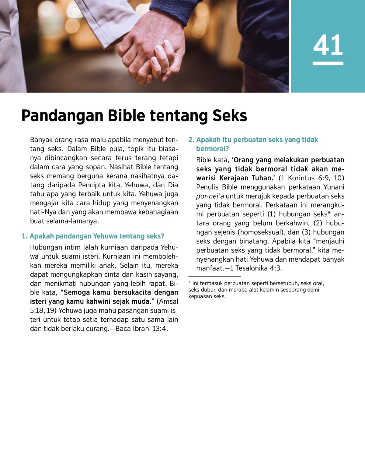 Banyak orang rasa malu apabila menyebut tentang seks. Dalam Bible pula, topik itu biasanya dibincangkan secara terus terang tetapi dalam cara yang sopan. Nasihat Bible tentang seks memang berguna kerana nasihatnya datang daripada Pencipta kita, Yehuwa, dan Dia tahu apa yang terbaik untuk kita. Yehuwa juga mengajar kita cara hidup yang menyenangkan hati-Nya dan yang akan membawa kebahagiaan buat selama-lamanya.