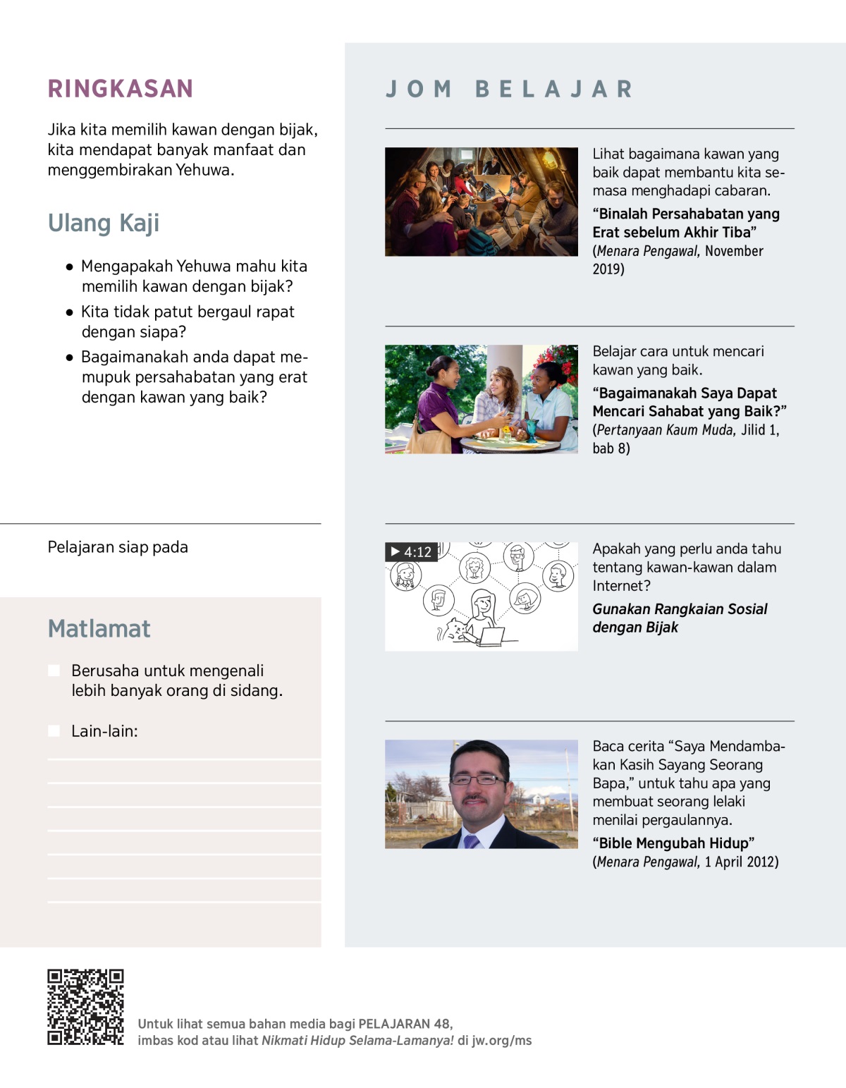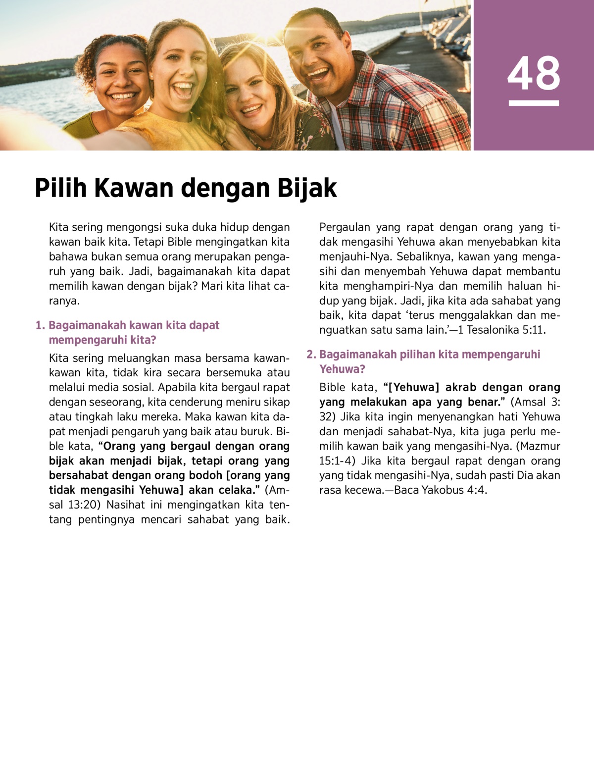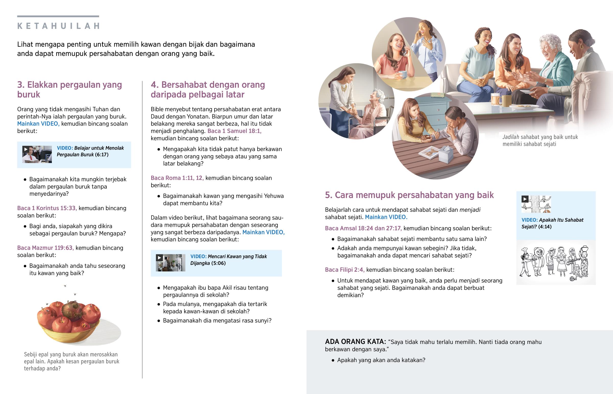 Kita sering meluangkan masa bersama kawan-kawan kita, tidak kira secara bersemuka atau melalui media sosial. Apabila kita bergaul rapat dengan seseorang, kita cenderung meniru sikap atau tingkah laku mereka. Maka kawan kita dapat menjadi pengaruh yang baik atau buruk. Bible kata, “Orang yang bergaul dengan orang bijak akan menjadi bijak, tetapi orang yang bersahabat dengan orang bodoh [orang yang tidak mengasihi Yehuwa] akan celaka.” (Amsal 13:20) Nasihat ini mengingatkan kita tentang pentingnya mencari sahabat yang baik. Pergaulan yang rapat dengan orang yang tidak mengasihi Yehuwa akan menyebabkan kita menjauhi-Nya. Sebaliknya, kawan yang mengasihi dan menyembah Yehuwa dapat membantu kita menghampiri-Nya dan memilih haluan hidup yang bijak. Jadi, jika kita ada sahabat yang baik, kita dapat ‘terus menggalakkan dan menguatkan satu sama lain.’—1 Tesalonika 5:11.